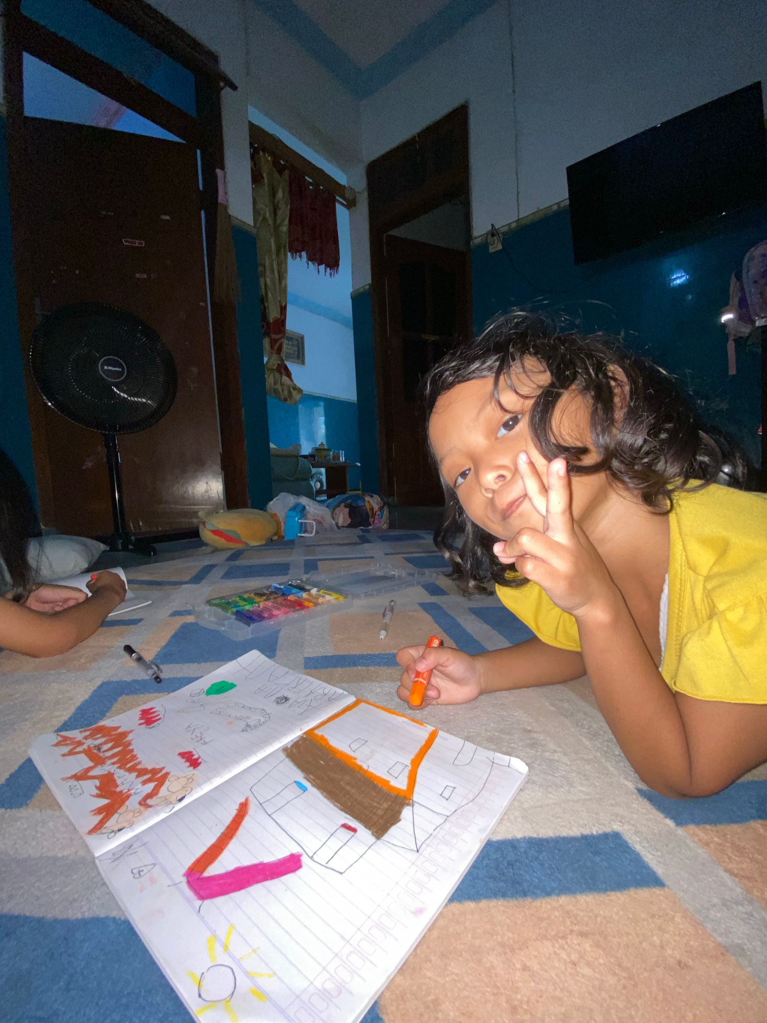An indoor scene in Gelam, Indonesia, depicts two individuals lying on a patterned rug engaged in drawing activities. In the foreground right, a young child with dark, curly hair, wearing a yellow top…read more