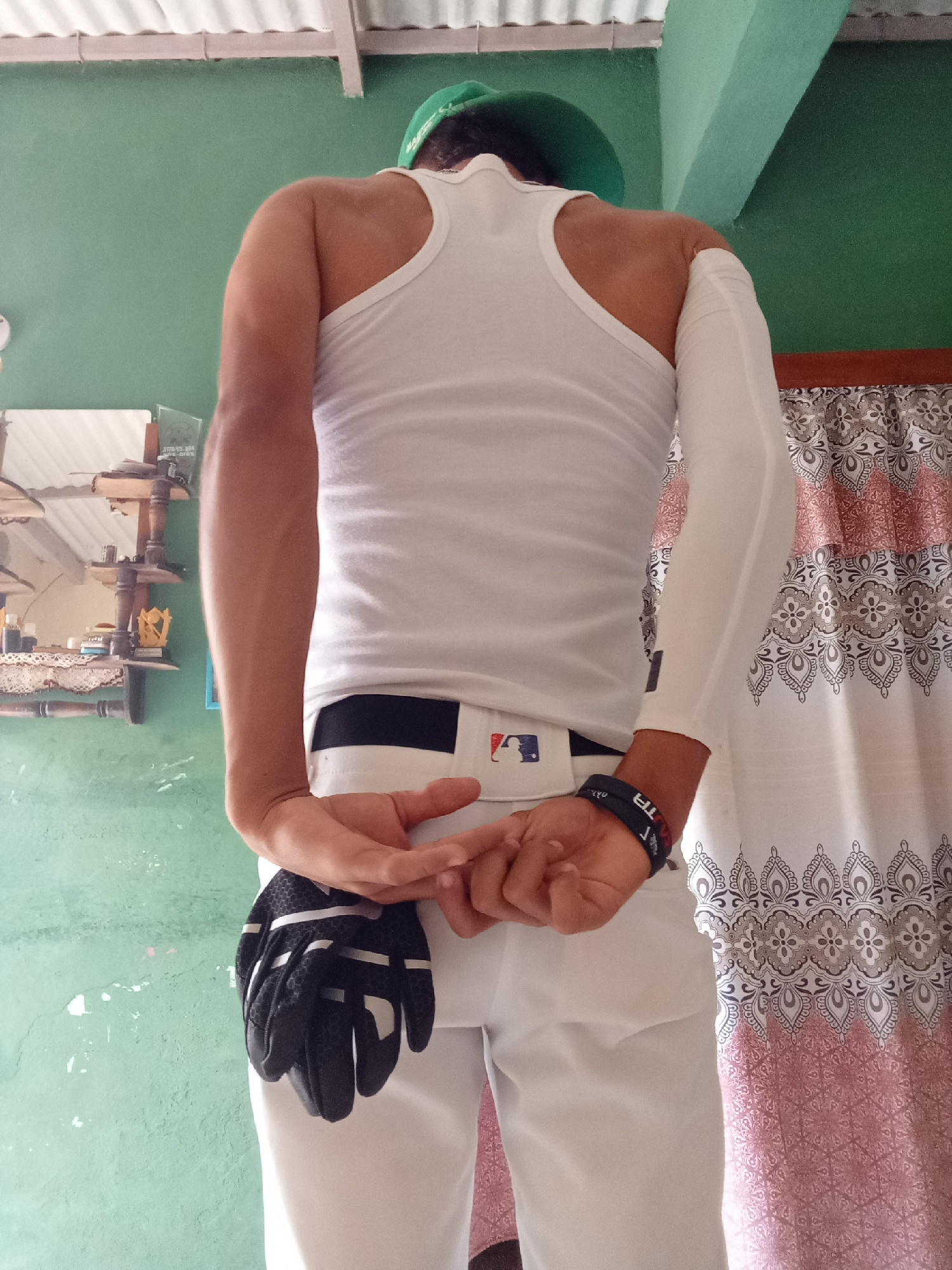 A man stands with his back to the viewer, facing a green wall with visible wear and tear. He is wearing a white tank top, white pants, and a white belt with a dark logo. The man has a green object on…read more