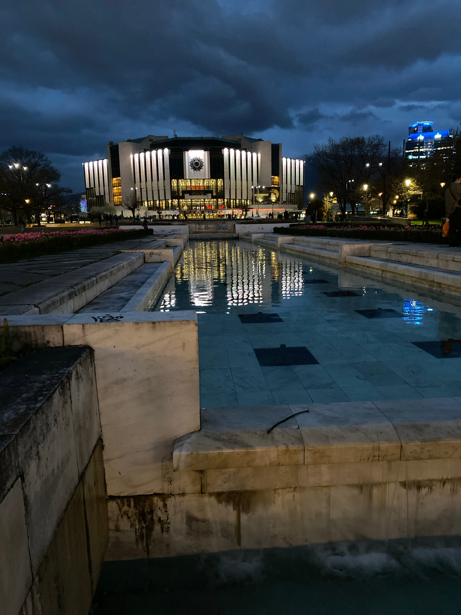 The image captures the National Palace of Culture in Sofia, Bulgaria, reflected in a water feature. The architecture of the palace is characterized by its elongated horizontal lines and illuminated wi…read more