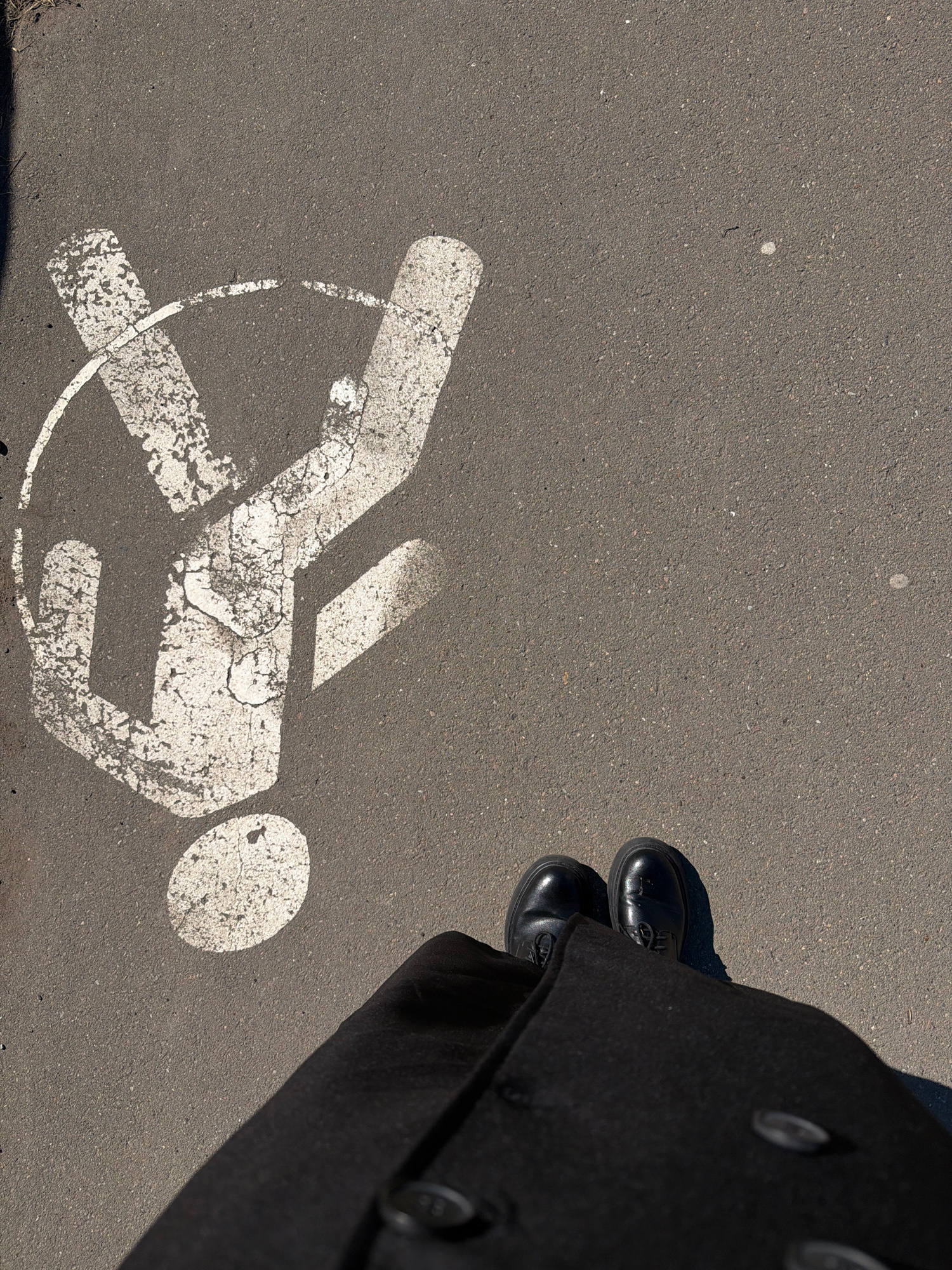 An eye-level outdoor shot depicts a gray asphalt surface with a faded white painted pedestrian crossing symbol indicating a person in motion. A person wearing black shoes and a long, dark coat with vi…read more