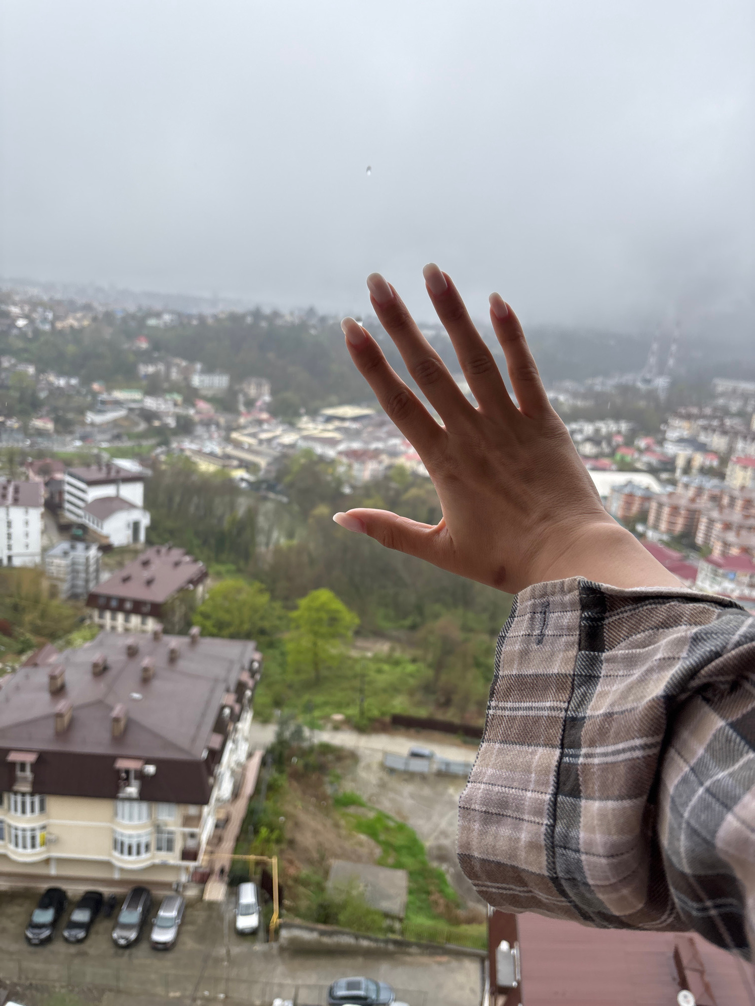A high-angle, slightly rotated, outdoor shot shows a hand extended over what appears to be a city. The hand, which is of a fair-skinned person, has light pink nails. The sleeve of a plaid shirt is vis…read more