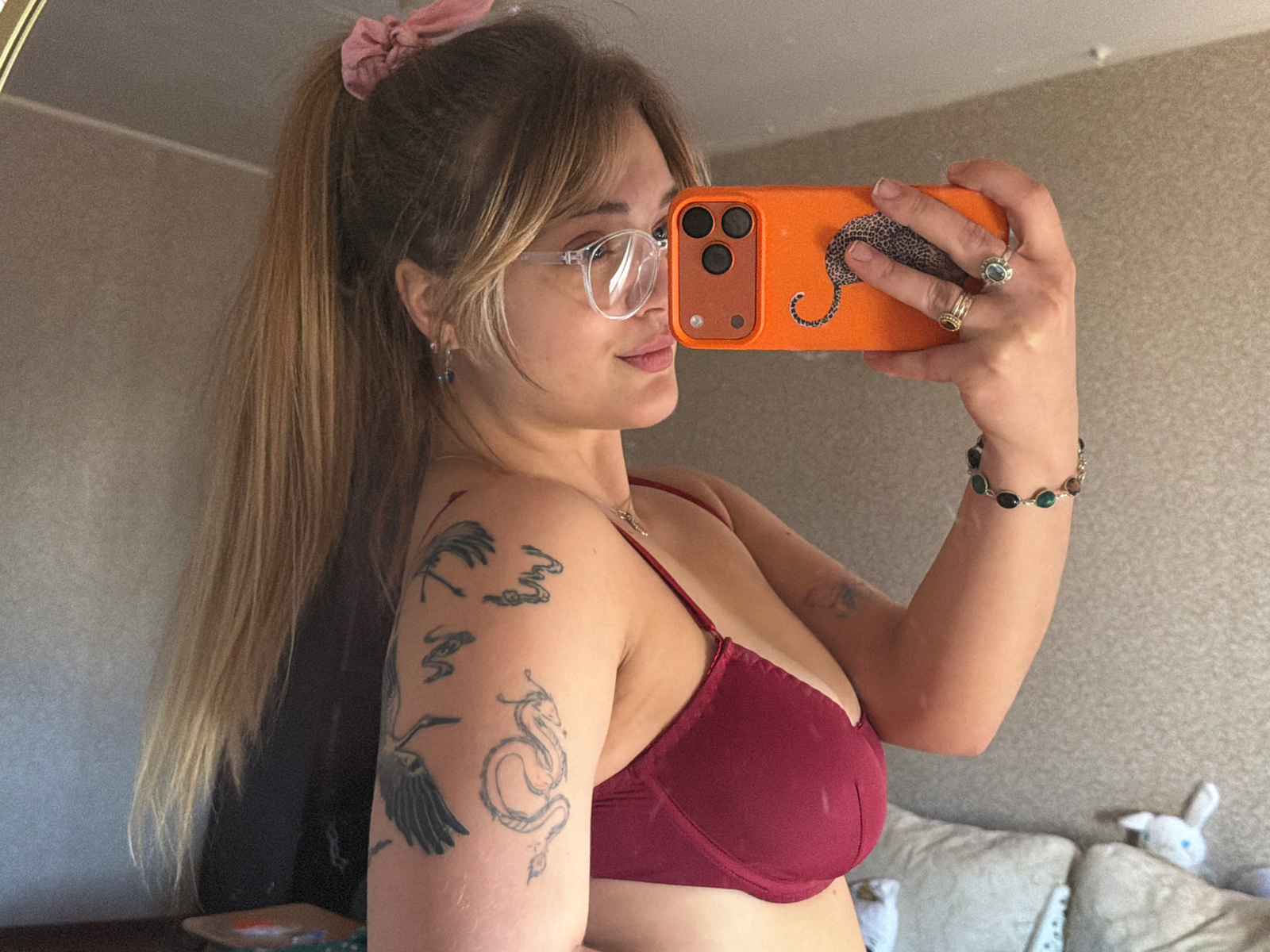 A young woman is holding an orange cell phone, with a drawing of a leopard on the back, and taking a selfie. She is wearing clear framed glasses, a pink scrunchie in her hair, a burgundy bra, and seve…read more
