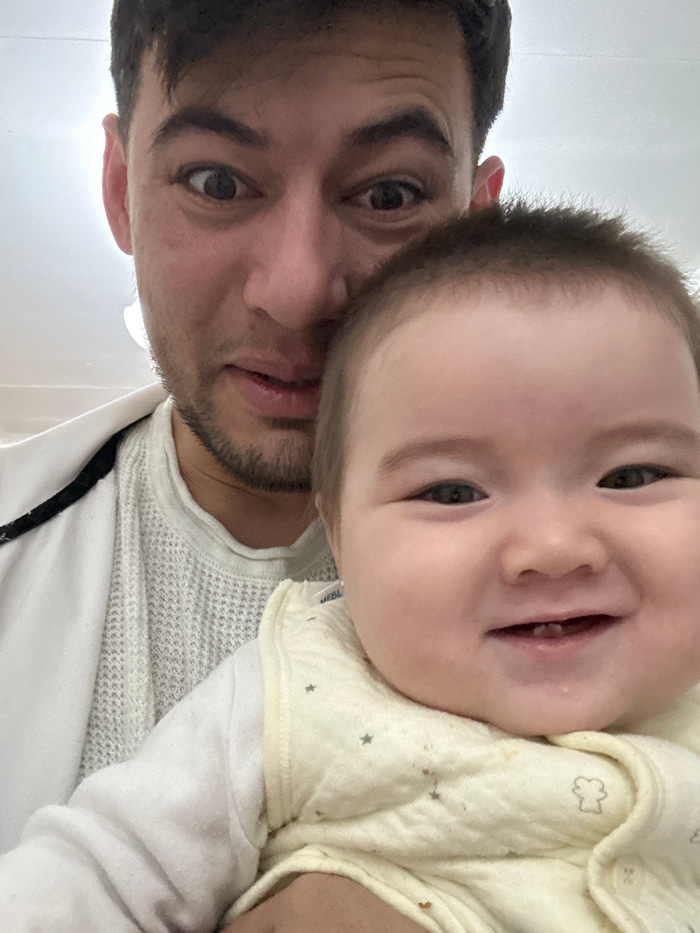 A selfie captures a man and a baby cheek-to-cheek. The man has dark hair, brown eyes, and a trimmed beard. The baby, nestled close, wears a patterned cream-colored top and has light brown hair and dar…read more