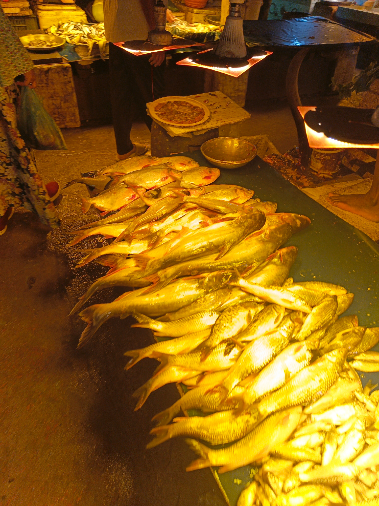 This image depicts a fish market scene, most likely in Dhaka, Bangladesh. The focus is on a large pile of fish of varying sizes and types arranged on a green surface, presumably a table or stall. Larg…read more