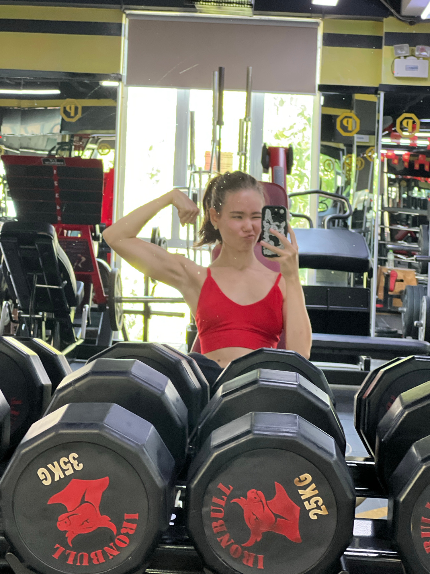 A full-shot mirror selfie, rotated 90 degrees clockwise, depicts a young woman posing playfully in a gym. The woman, with light skin and dark hair tied back, wears a red sports bra. She pouts her lips…read more