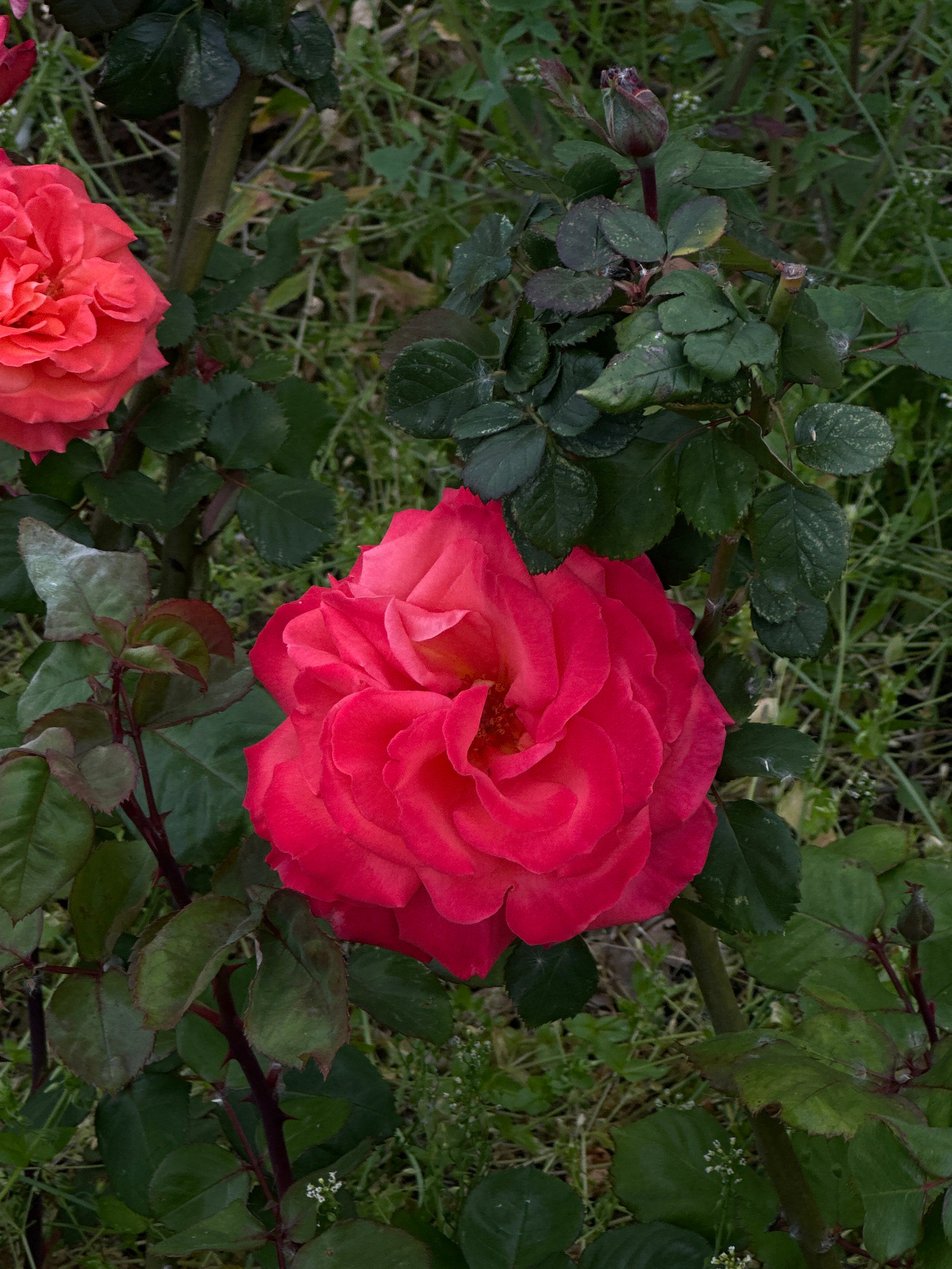 A close-up shot captures a vibrant red rose in full bloom, surrounded by green leaves. Another rose, partially visible at the bottom left, suggests a garden setting. The image was likely taken in Bar,…read more