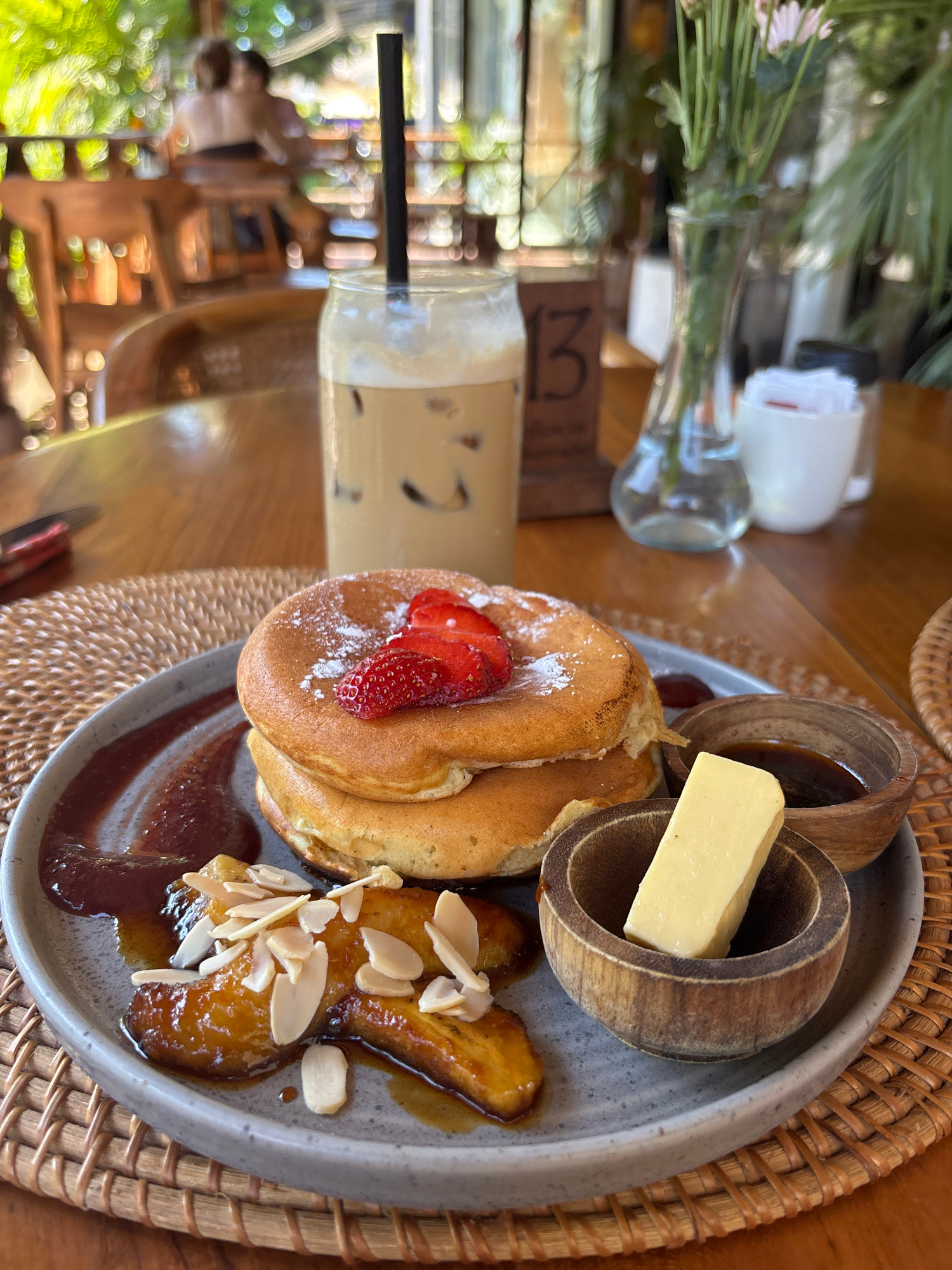 The image shows a plate of pancakes with strawberries, bananas topped with almond slices, a wooden bowl of butter, and a wooden bowl of syrup. The plate rests on a woven placemat. A glass of iced coff…read more