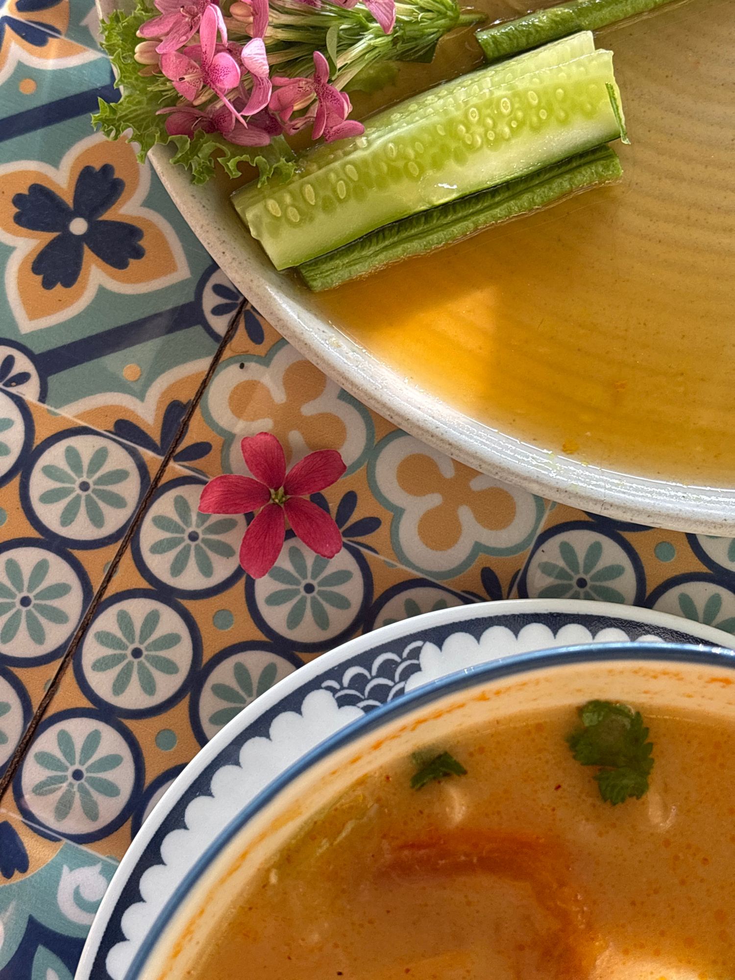 The image captures a close-up, high-angle view of two bowls of food on a patterned tile surface. The setting is Choeng Thale, Thailand. On the left, a bowl contains a light yellow-colored broth with…read more
