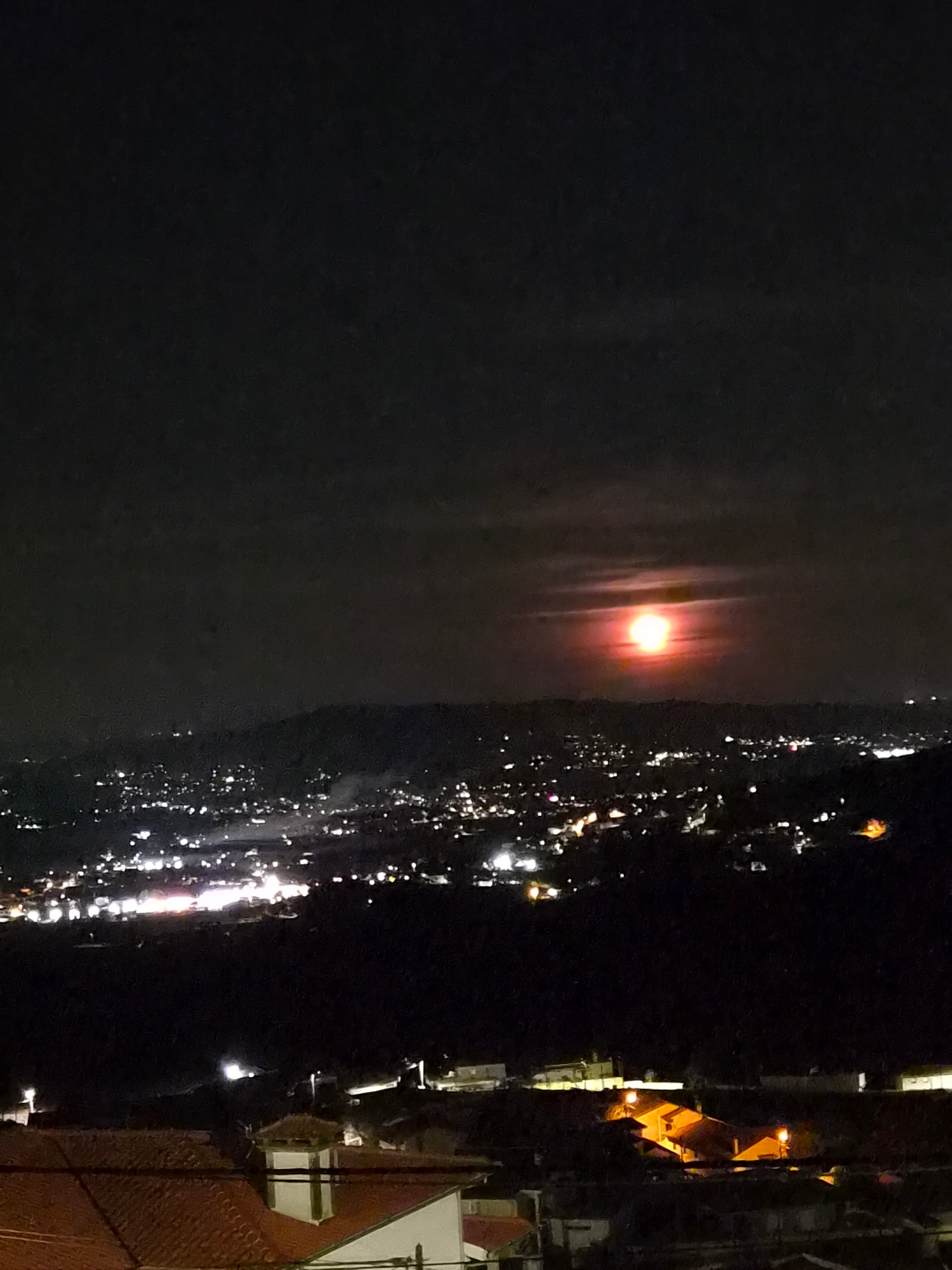 A nighttime view of Barcelos, Portugal, shows a dark body of water on the left with a red reflection from a light source above. The city skyline on the right is marked by numerous small lights scatter…read more