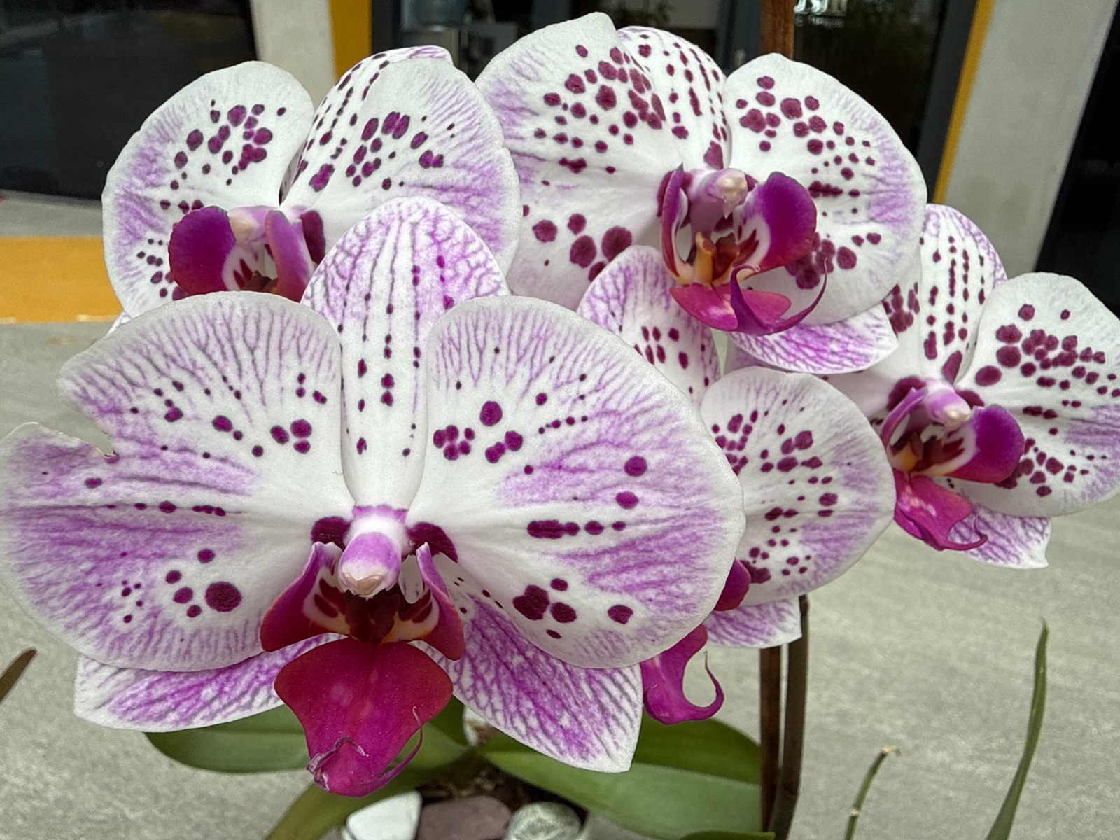 The image displays a close-up, front-facing view of a cluster of six white Phalaenopsis orchid flowers, reportedly located in Alanya, Turkey. Each bloom features white petals mottled with irregular da…read more
