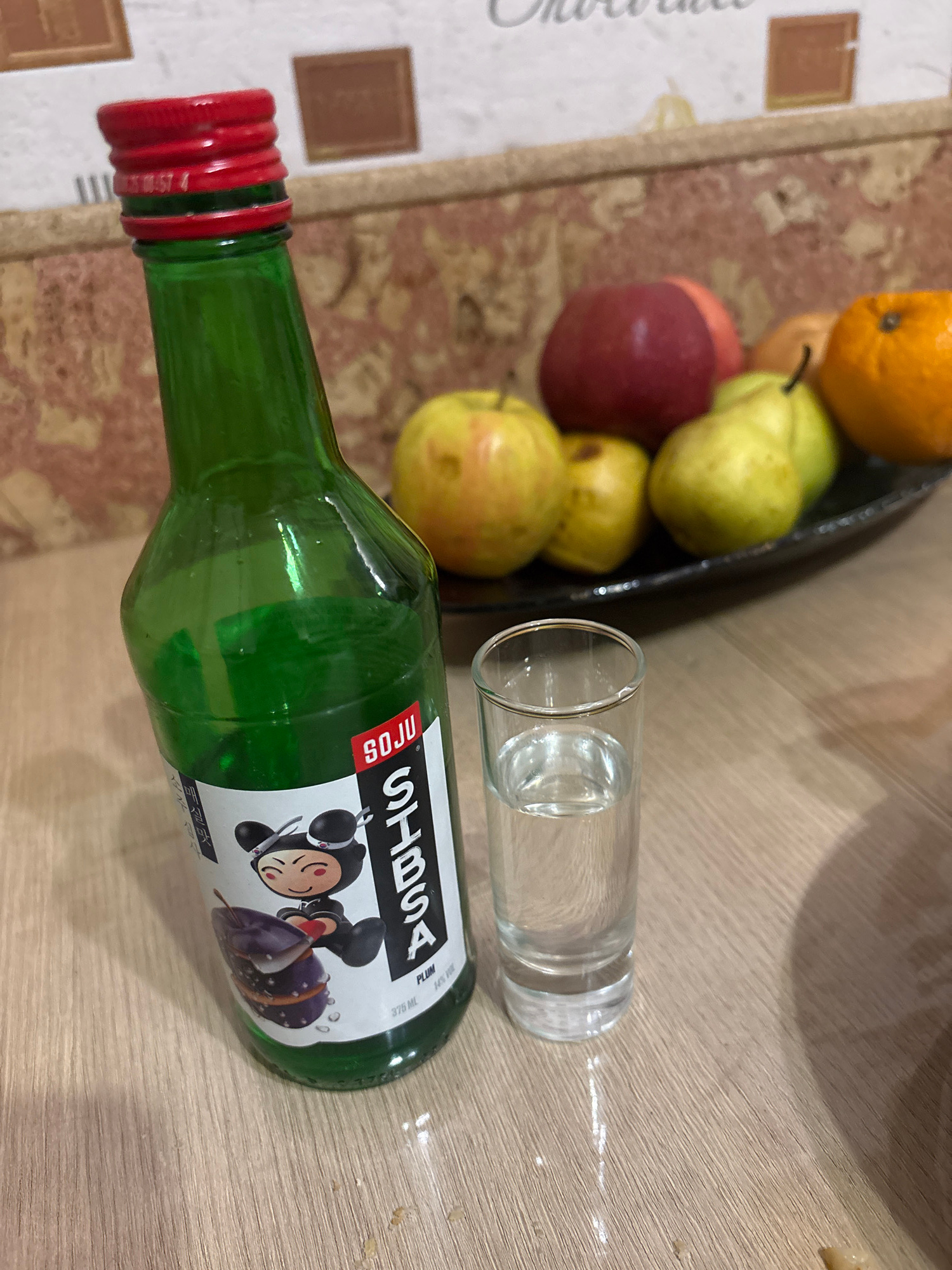 The image shows a still life scene. A green glass bottle with a red cap and a label that reads "SOJU" and "BTS" is laying horizontally on a wooden surface. Next to the bottle is a clear glass filled w…read more