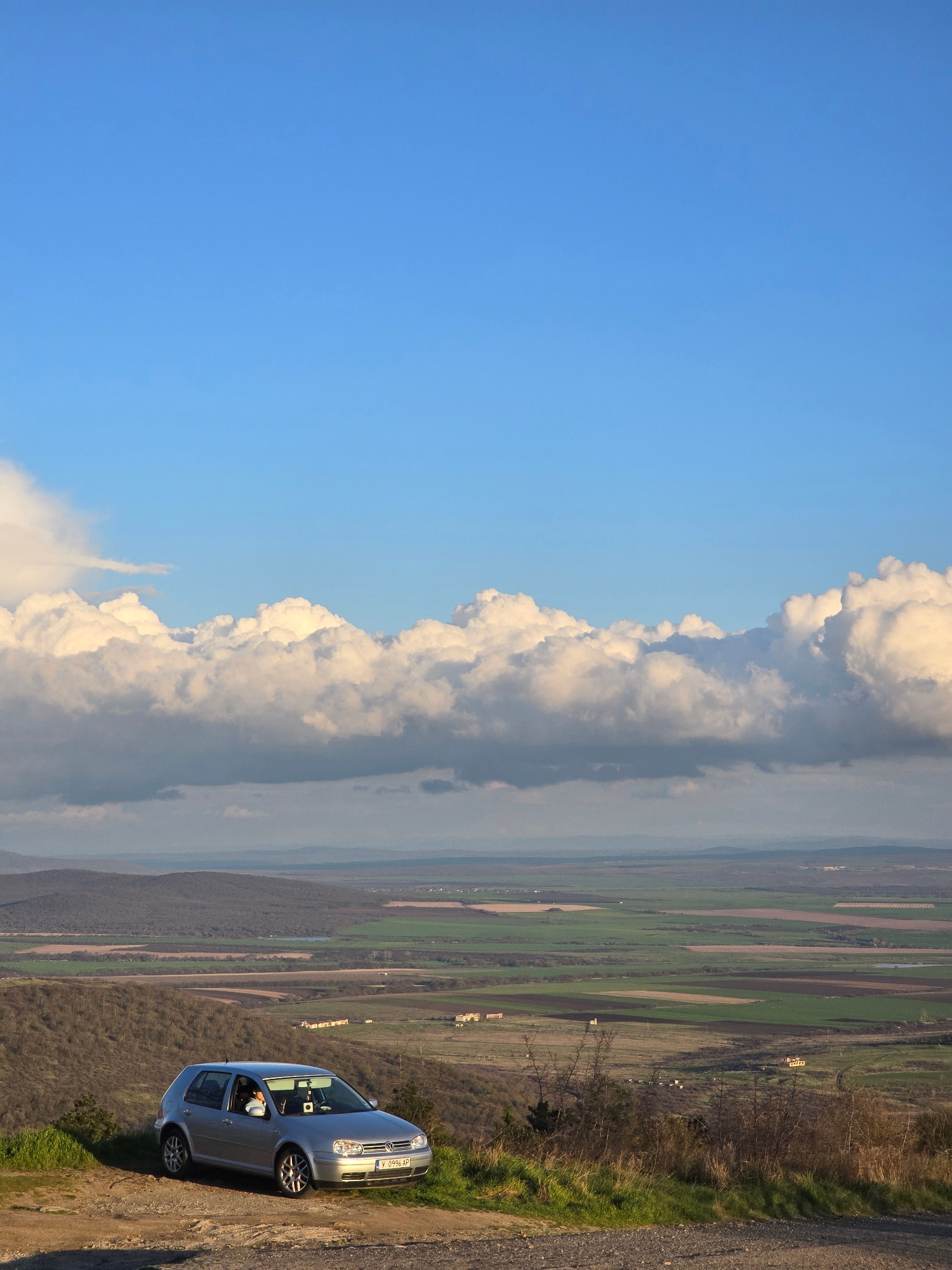 A silver sedan is parked on a grassy verge beside a dirt road in Pobeda, Bulgaria, offering a panoramic view of the landscape. The sky, largely clear and blue, transitions into a dense bank of cumulus…read more