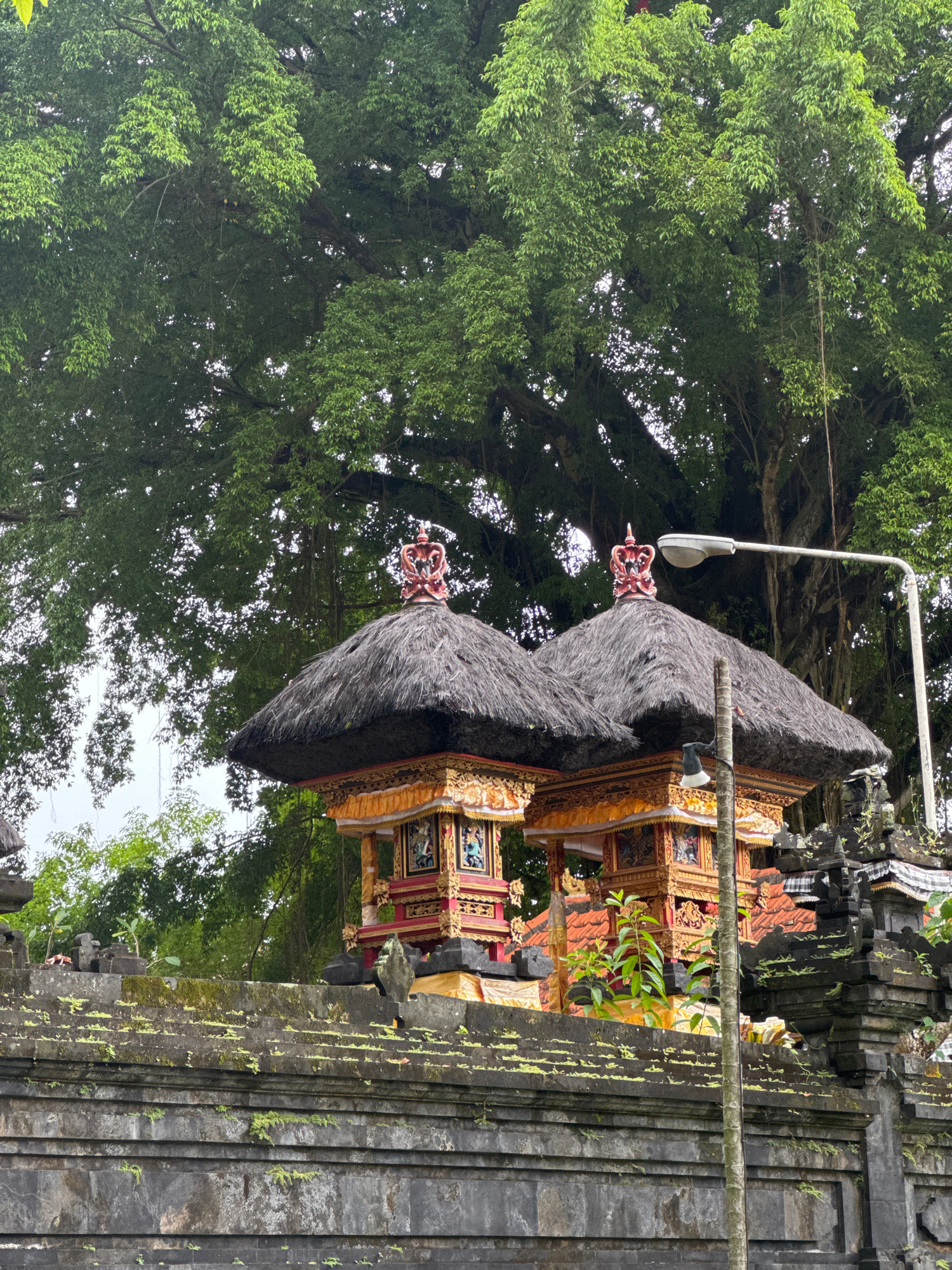 This image depicts a traditional Balinese temple structure, likely a Pura, nestled within a vibrant tropical landscape. The temple features a distinctive multi-tiered roof, appearing dark grey or blac…read more