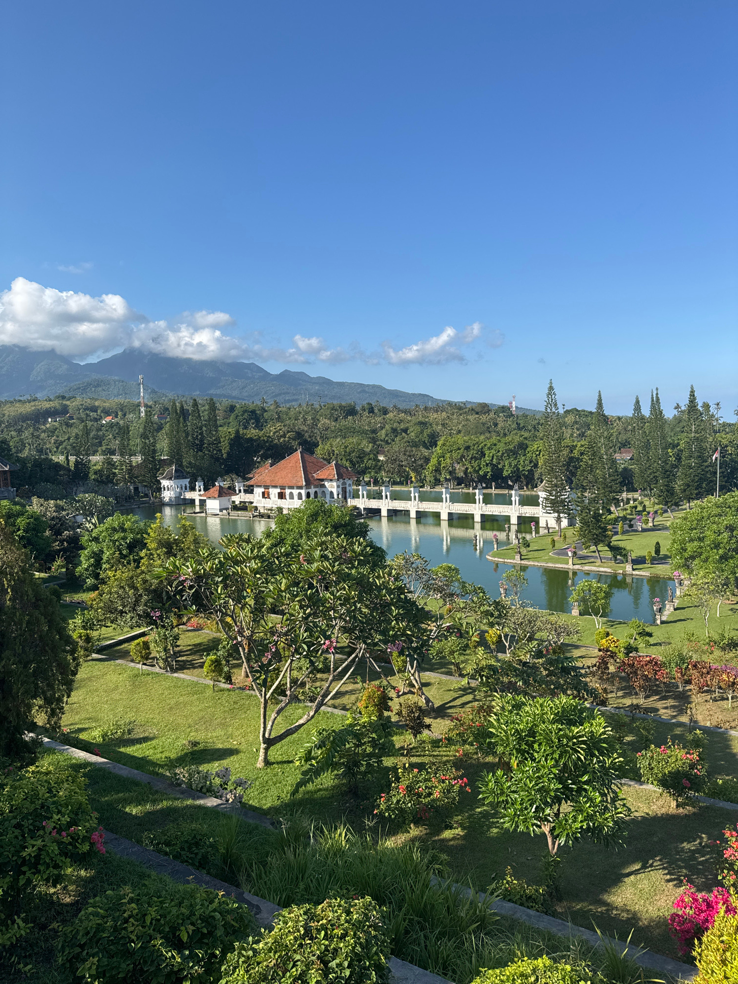 The image presents a panoramic view of a lush, expansive garden or water palace under a clear blue sky. In the foreground and midground, manicured green lawns are interspersed with a rich variety of t…read more