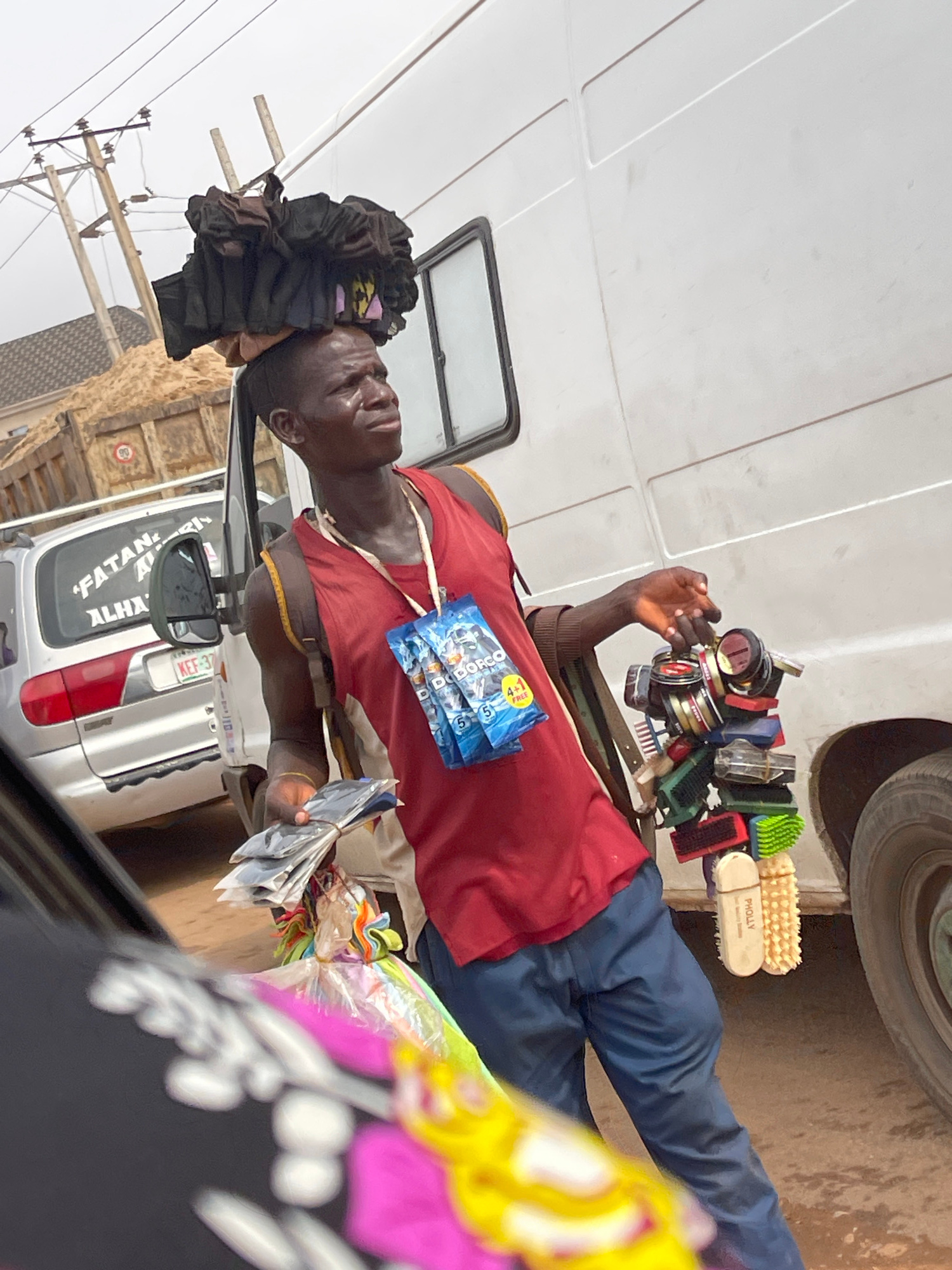 This image depicts a street vendor in Ado, Nigeria, captured during the daytime, likely from inside a vehicle. The vendor, an adult male with dark skin and a dark head covering, is seen wearing a redβ¦read more