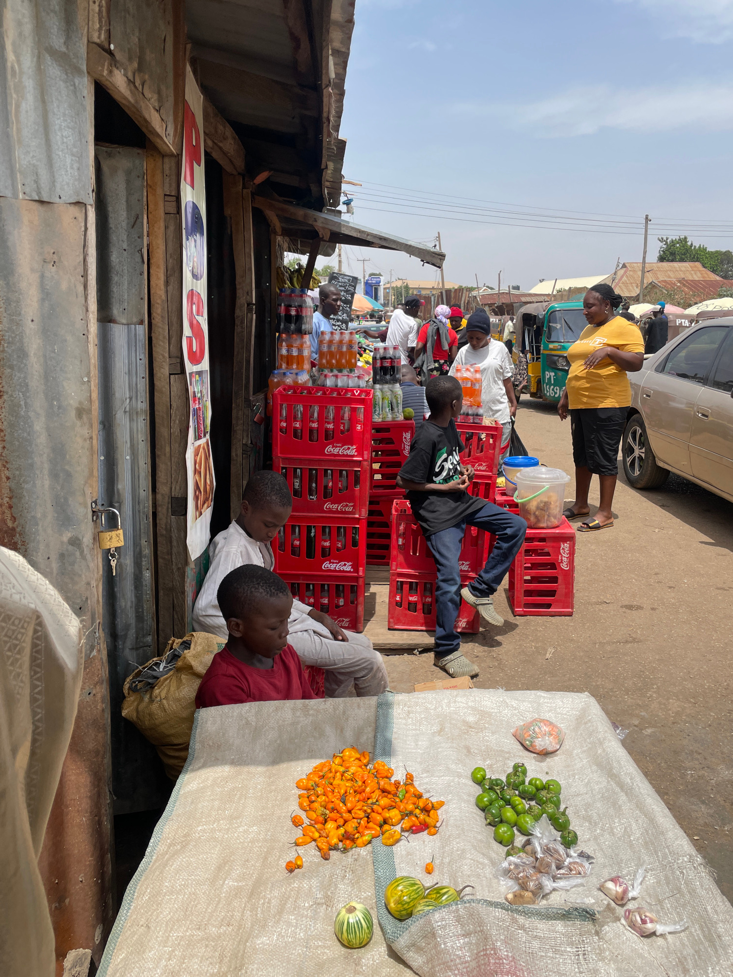 The image captures a scene in Jos, Nigeria, depicting a bustling street market. In the foreground, two boys are resting on a platform or wooden surface next to a market stall with a bag underneath. A…read more