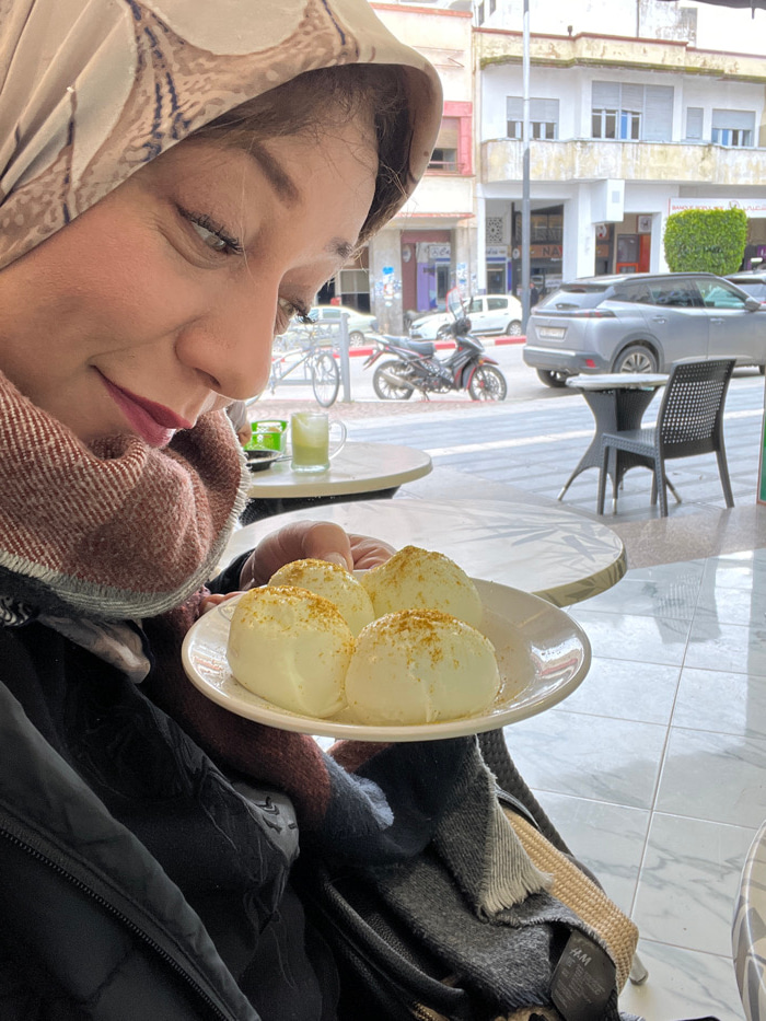 The image depicts an indoor scene looking out onto a city street in Meknes, Morocco. In the foreground, positioned to the left, an adult female is partially visible from the chest up, looking downward…read more