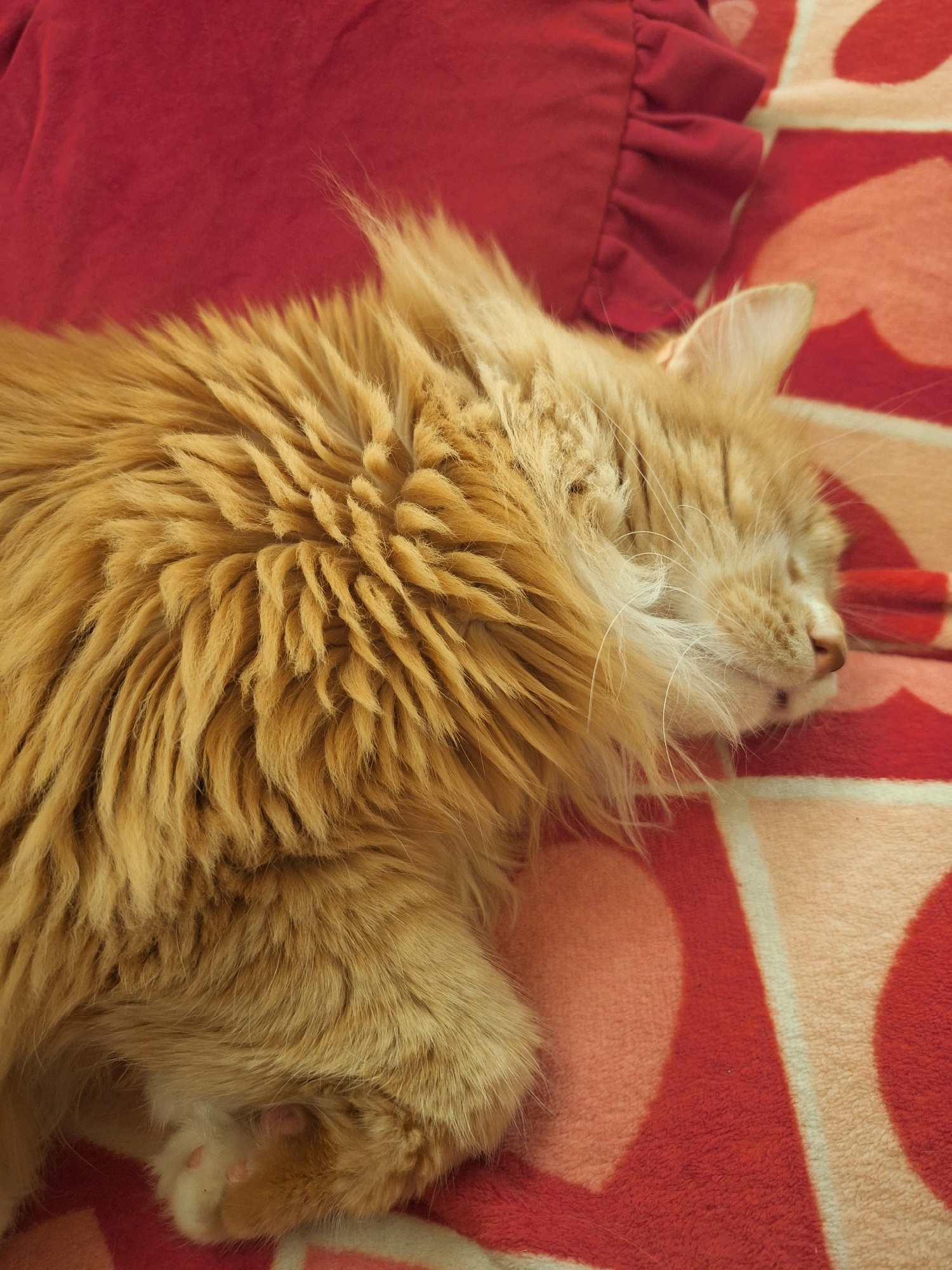 A close-up, high-angle shot shows a long-haired, golden-colored cat sleeping on a red and light orange patterned blanket with a red pillow in the background. The cat is curled up, with its head tilted…read more