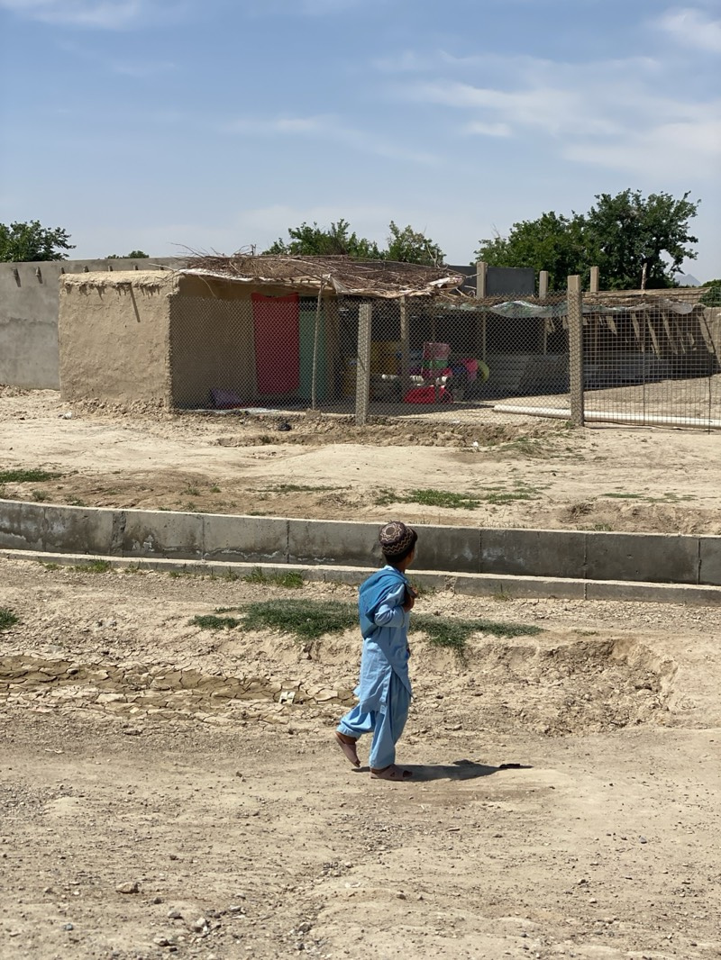 A full outdoor shot shows a boy dressed in a traditional blue outfit walking away from the viewer down a dirt road in Deh-E Bagh, Afghanistan. He is barefoot. Behind him are buildings made of stucco.…read more