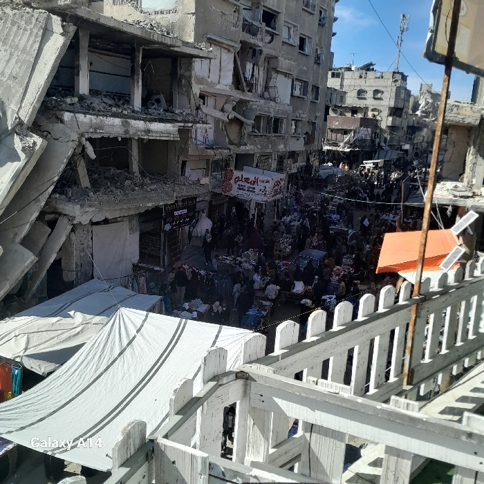 The image depicts a crowded street market amidst extensively damaged urban infrastructure in Khan Yunis, Palestinian Territory, captured from an elevated perspective. In the foreground, a white painte…read more