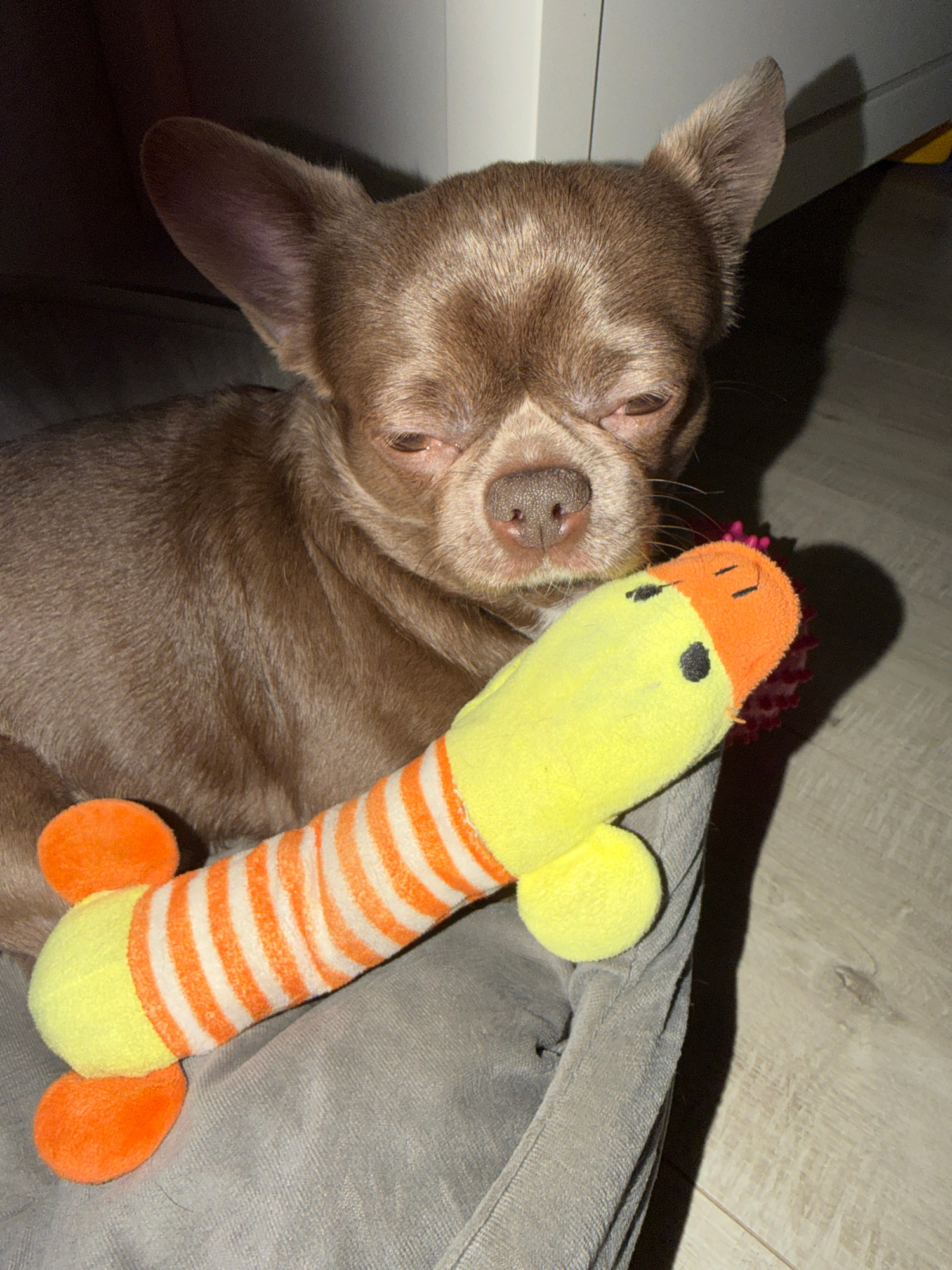 A brown chihuahua lies in a gray dog bed next to a yellow and orange stuffed duck toy. The dog is facing the left side of the frame, with its head resting on the duck. The dog bed is on the floor, whi…read more