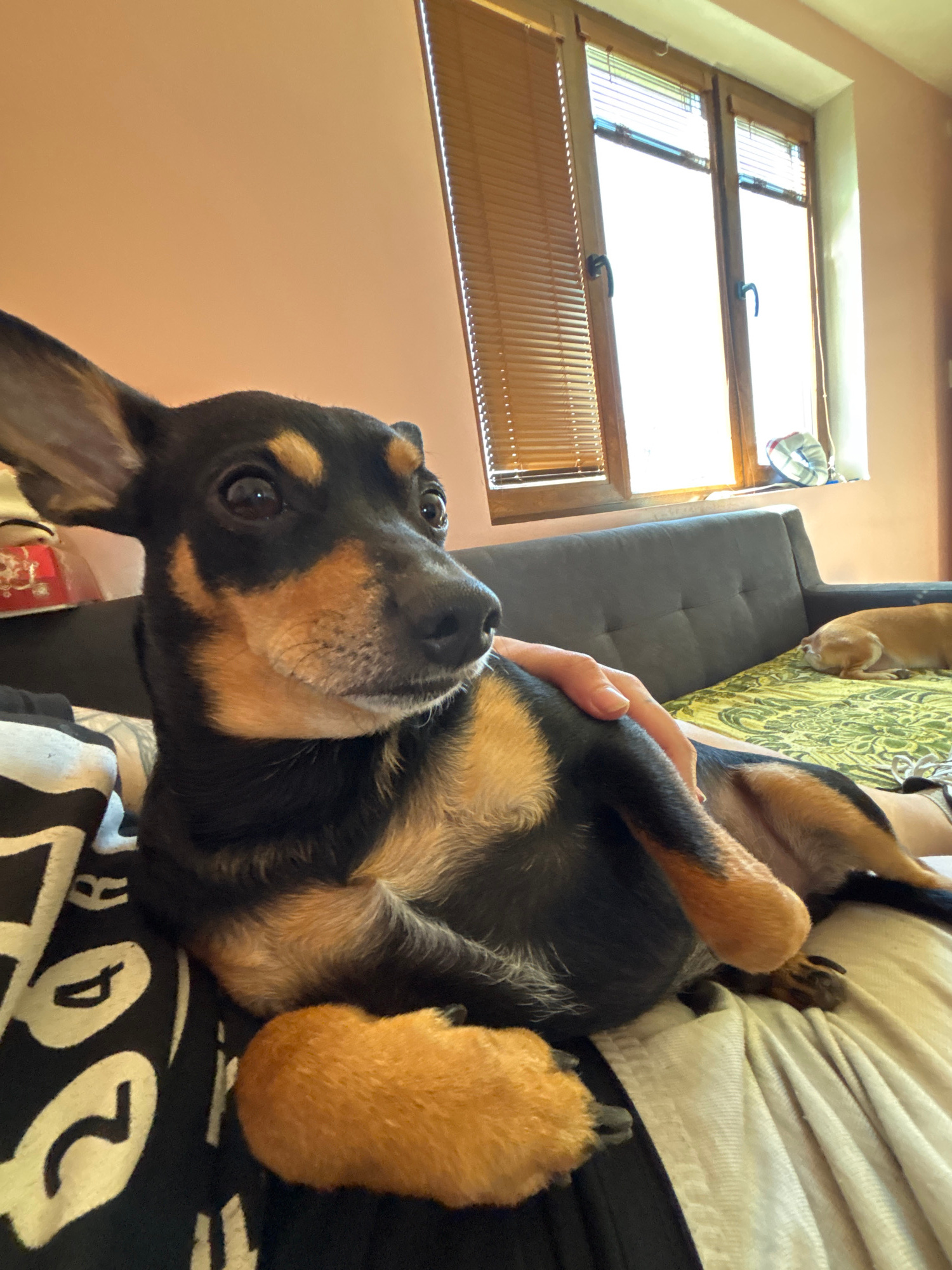A dachshund-type dog rests upside down on a person's lap. The dog has black and tan fur. A hand is visible near the dog's head. The person is wearing clothing with a black and white pattern. Behind th…read more