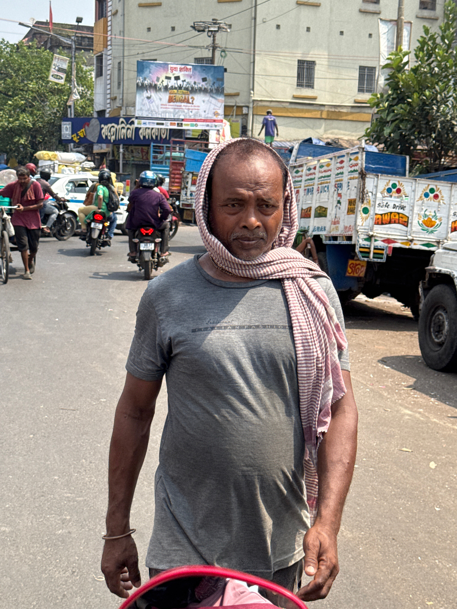 A medium shot depicts a middle-aged, dark-skinned man wearing a grey t-shirt and a red and white checkered headscarf, situated in what appears to be a street in Kolkata, India. He is looking directly…read more
