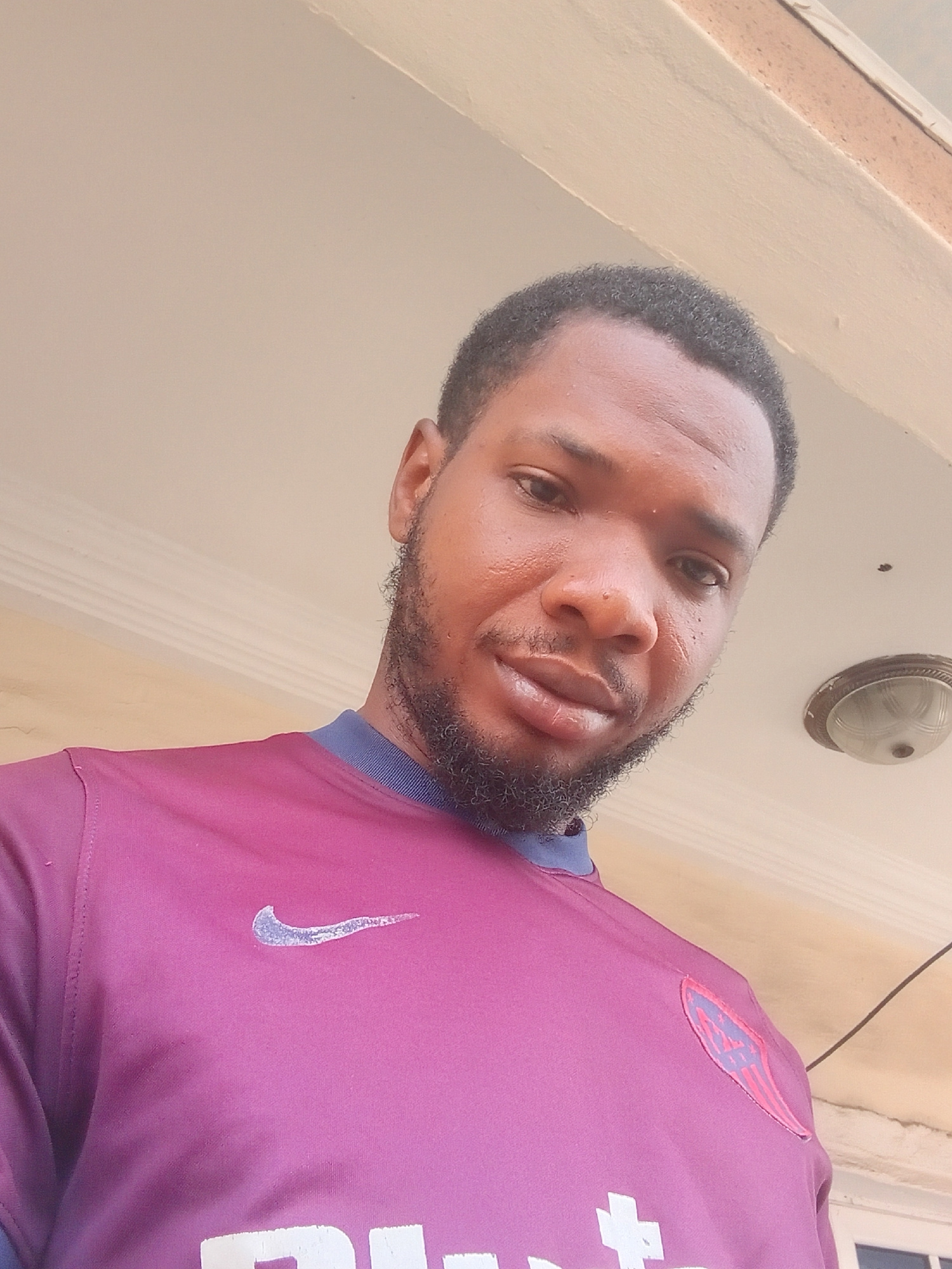 A close-up shot, tilted, depicts a man indoors. He is wearing a maroon athletic shirt with a blue collar and a Nike swoosh logo in silver on the upper right chest. Part of a white plus symbol is visib…read more