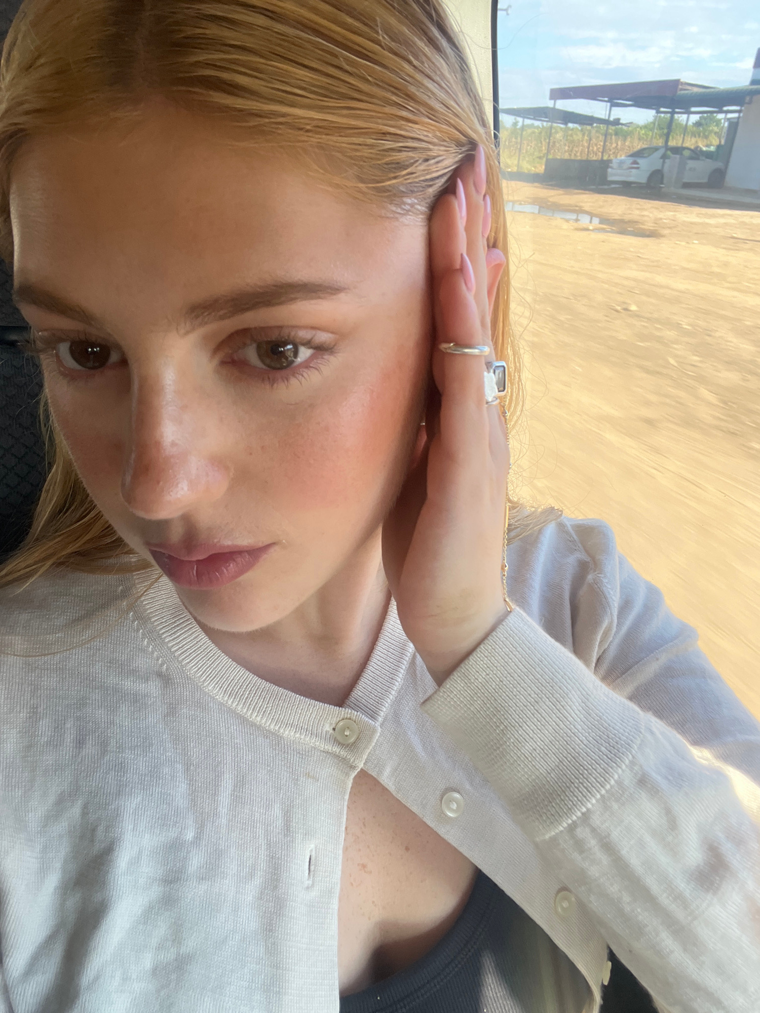 A blonde woman wearing a light-colored cardigan is posing for a selfie. Her right hand is touching her forehead, and she is wearing two rings on that hand. The background is blurred, but it appears to…read more
