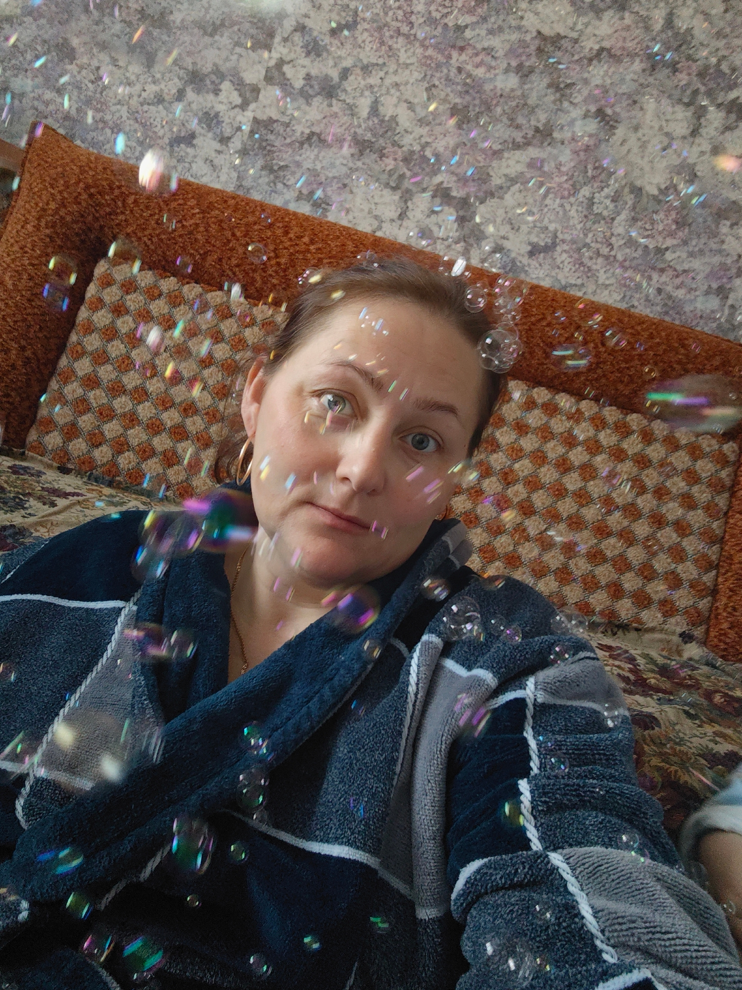 A woman is taking a selfie, indoors, seemingly in a home. She is wearing a blue and gray bathrobe. She has fair skin, and is wearing gold hoop earrings. There are bubbles floating around her in the fo…read more