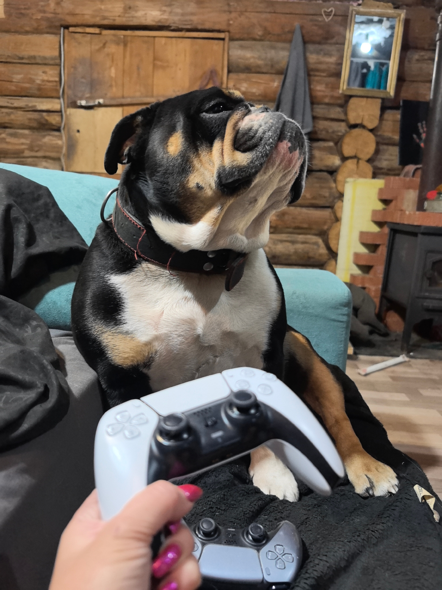 A medium-shot captures a black, tan, and white bulldog wearing a black collar as the central figure. The dog is situated on a turquoise couch in front of a log cabin wall. A hand holding a white PlayS…read more