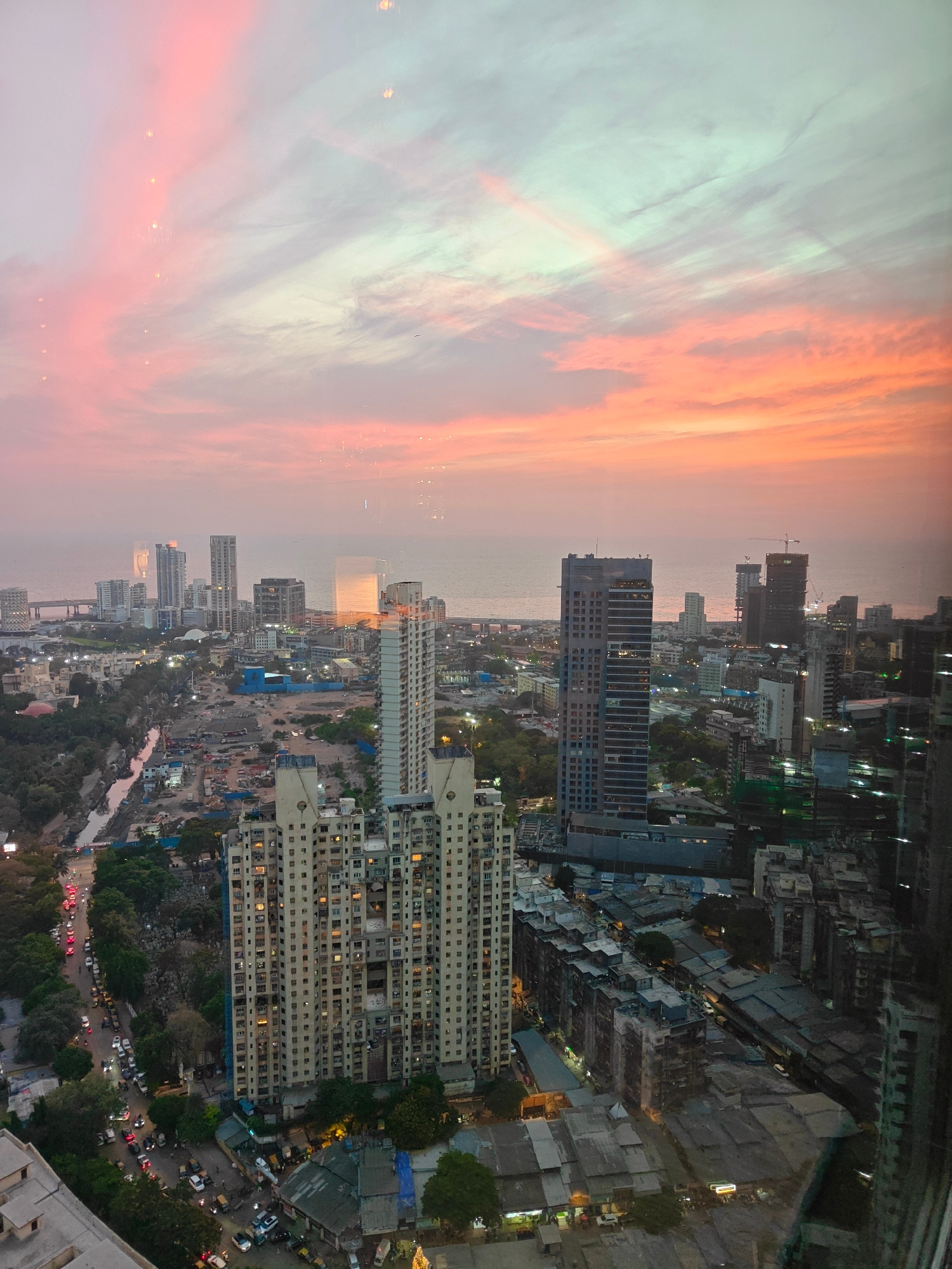The image captures a panoramic view of the Mumbai cityscape during sunset or dusk. The sky is illuminated with soft, colorful clouds, displaying gradients of vibrant pink and orange that fade into ligβ¦read more