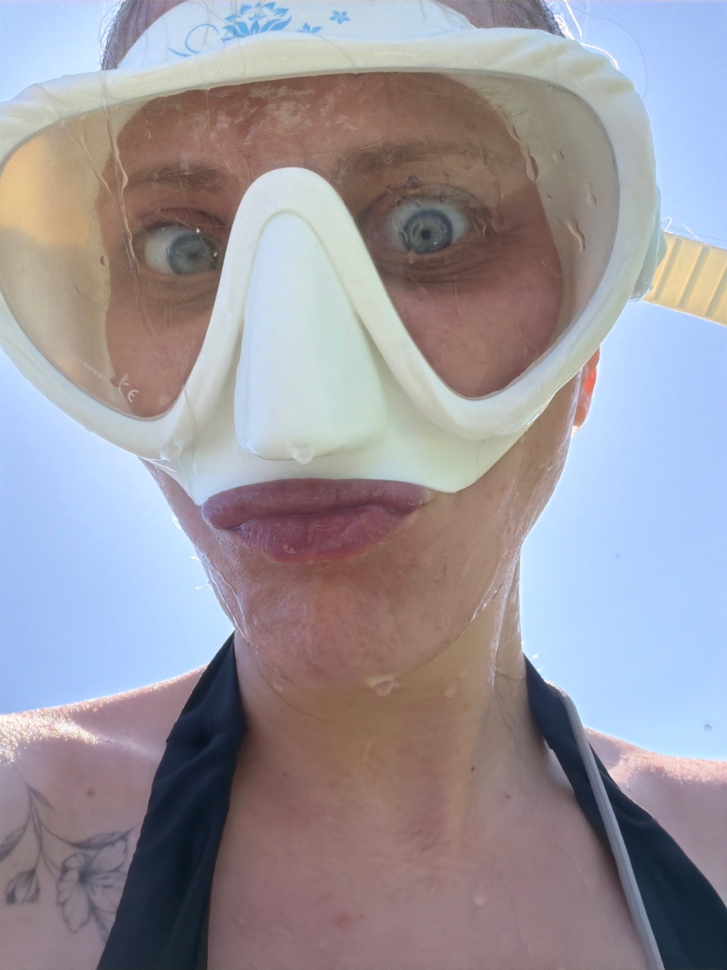 A female individual is depicted in a close-up, low-angle shot, apparently just having emerged from water, evident by numerous droplets on her skin and a white snorkel mask. She directly faces the came…read more