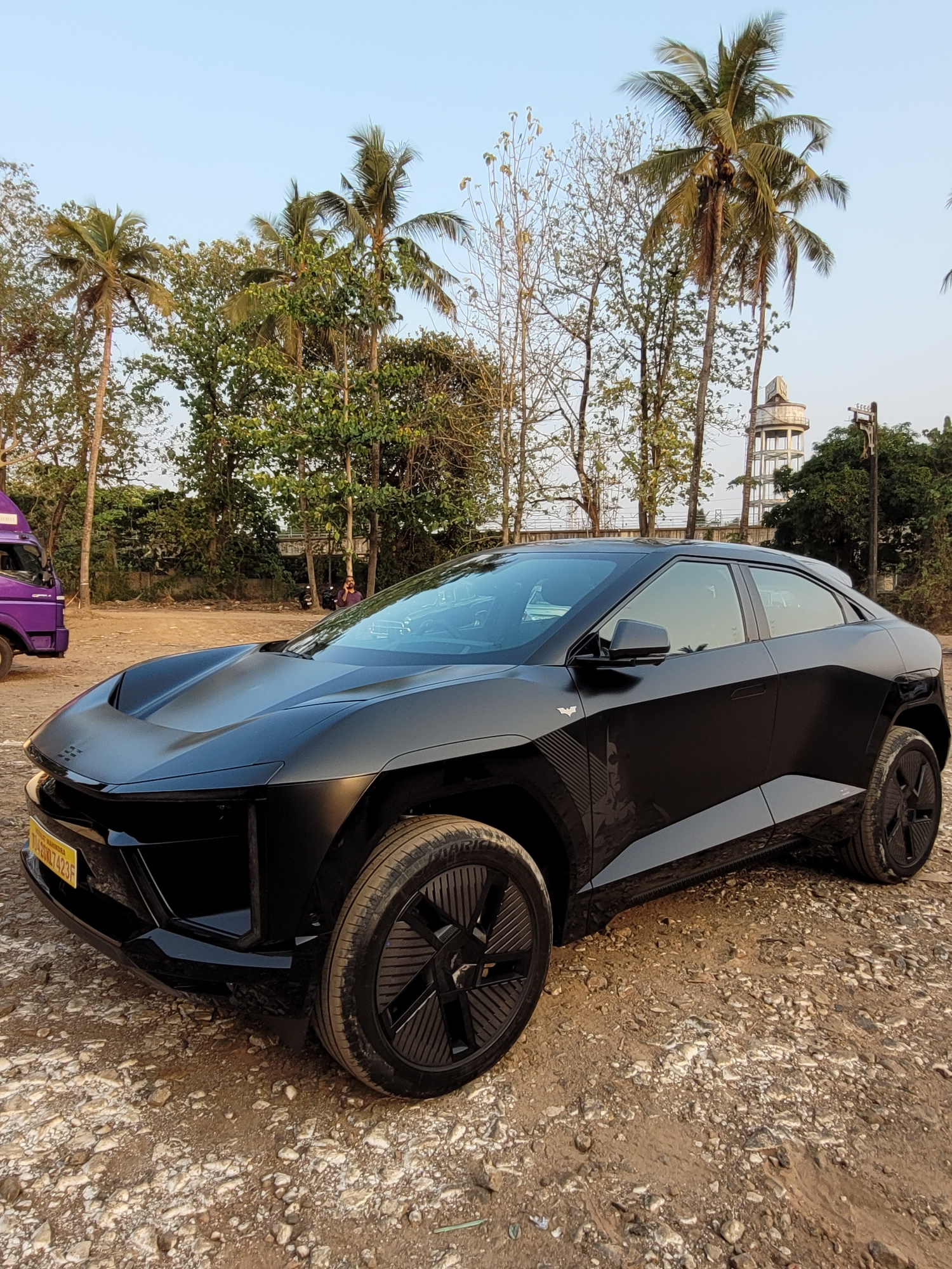 The image shows a black car parked on a dirt and gravel road. Palm trees and other trees are visible in the background, with a building with a dome-like structure appearing among the trees. The sky isβ¦read more