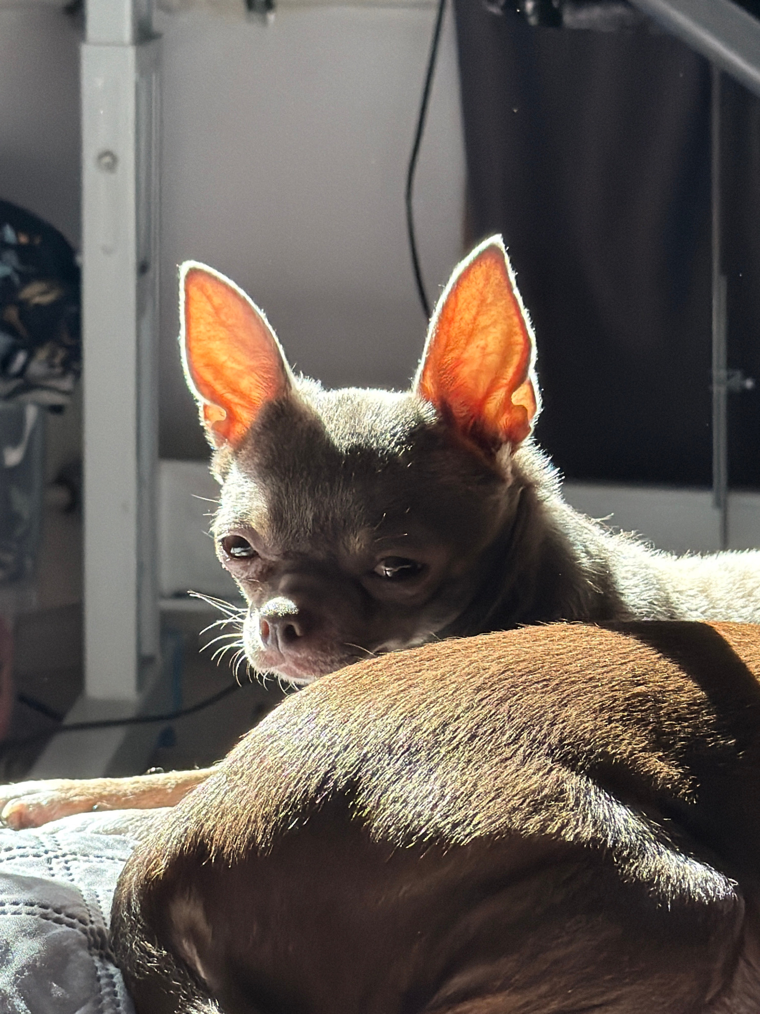 A close-up shot depicts a small, light-colored dog with large, illuminated ears, partially obscured by a larger, brown-furred dog. The smaller dog's head is tilted, with visible whiskers and eyes, pos…read more