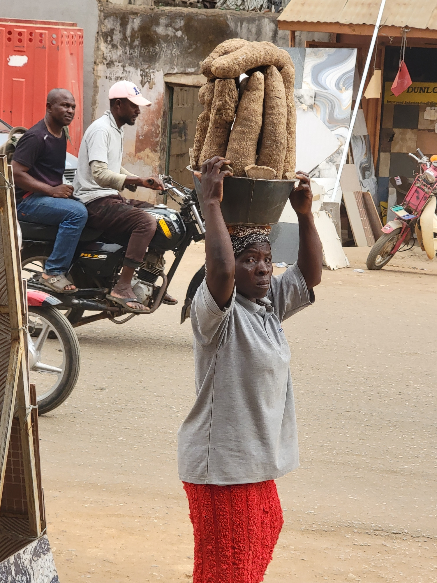 In Maiburiji, Nigeria, an adult woman wearing a gray shirt, red pants, and a patterned headscarf carries a large collection of yams in a black container on her head. She looks toward the viewer. Behin…read more