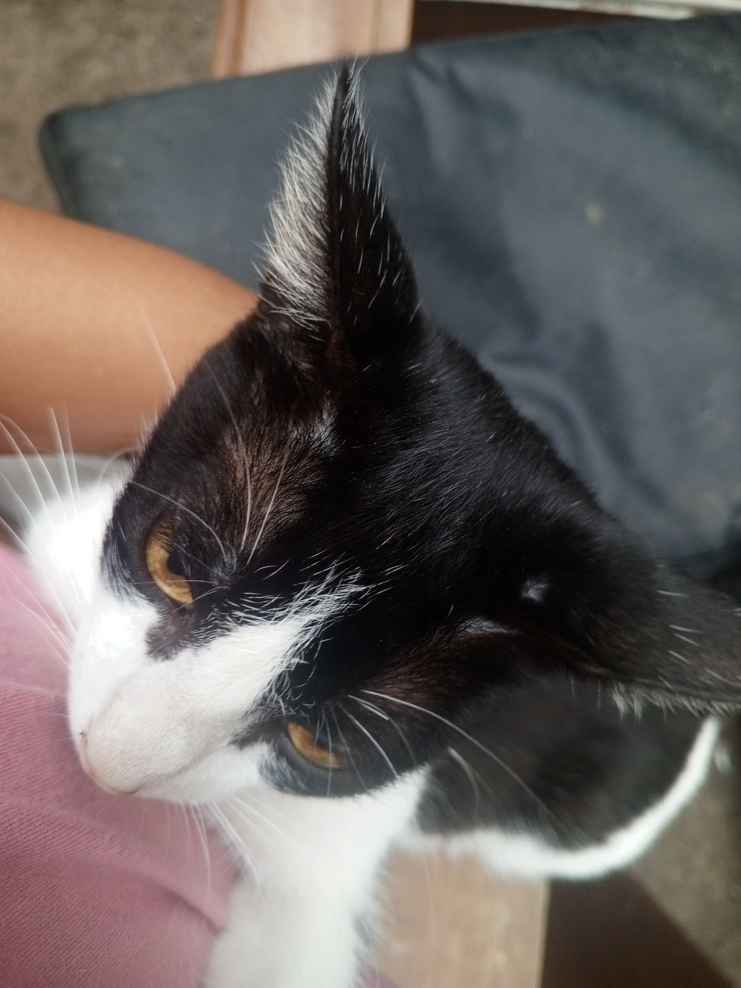 The image presents a close-up, high-angle view of a black and white cat with striking amber-gold eyes. The cat's head is tilted slightly upwards and away from the camera, revealing its distinct tuxedo…read more