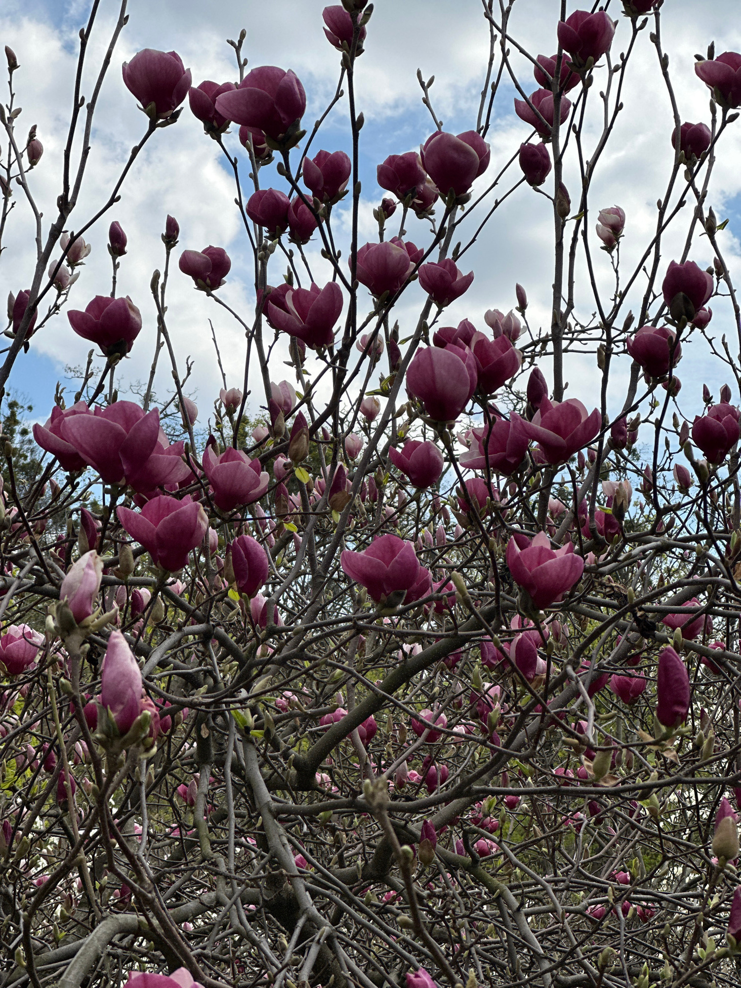 The image displays a close-up, low-angle perspective of a blooming Magnolia tree, looking upwards through its branches towards the sky. The tree is adorned with numerous vibrant magenta and purple flo…read more
