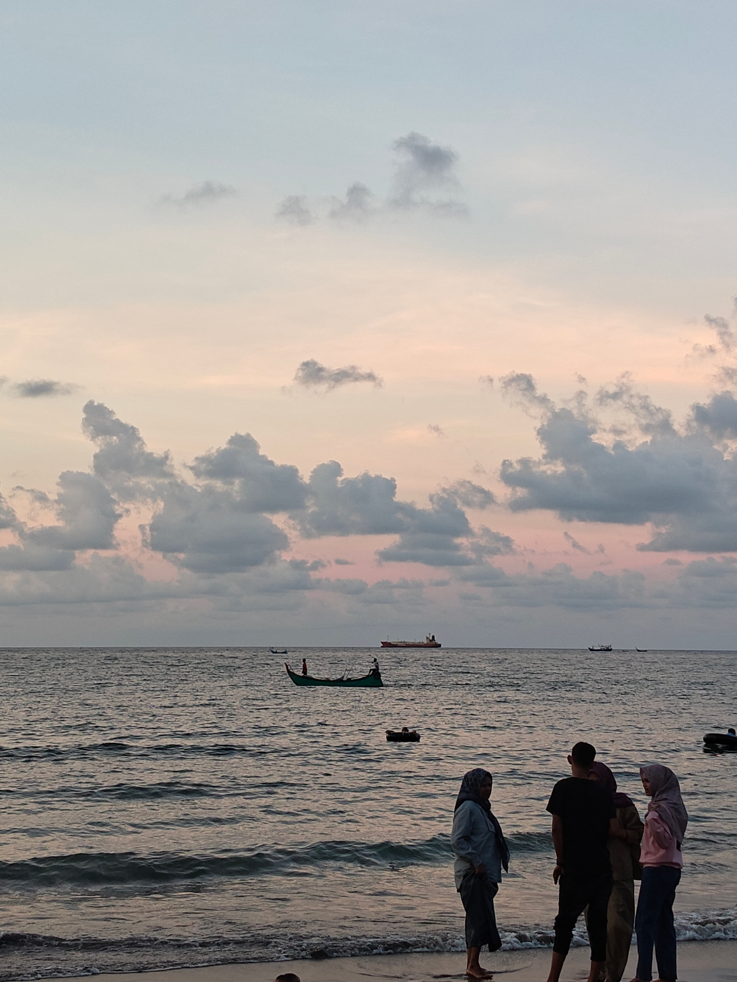 The image depicts a beach scene in Lhokseumawe, Indonesia, at dusk. A group of four people stands near the shoreline; two women wear hijabs. In the background, the ocean is visible with several small…read more