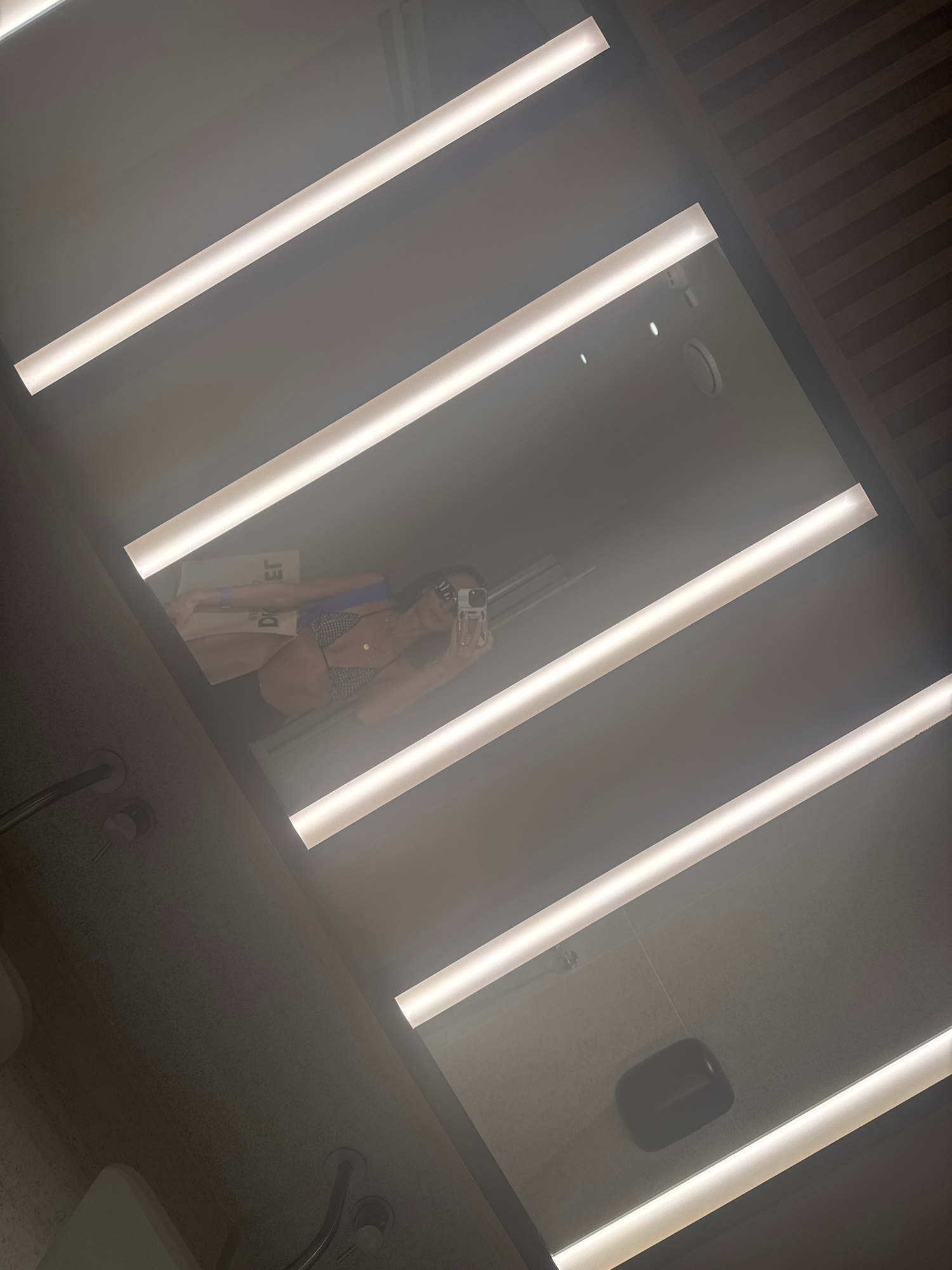 A person stands in front of a mirror taking a photo with a smartphone. The person has sunglasses and a bikini top with a white tote bag and a blue shoulder strap. There are 4 vertical lights in the mi…read more