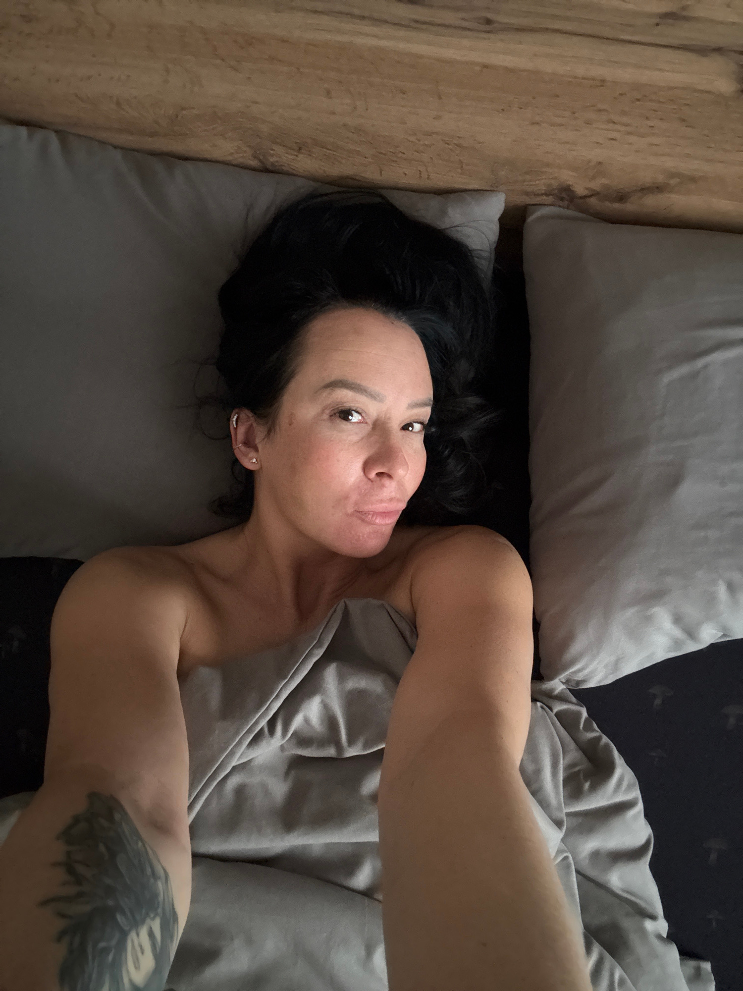 A woman with dark, loosely curled hair is depicted lying in bed, looking directly at the camera with a relaxed expression. Her lips are slightly parted, and she has visible ear piercings in her left e…read more