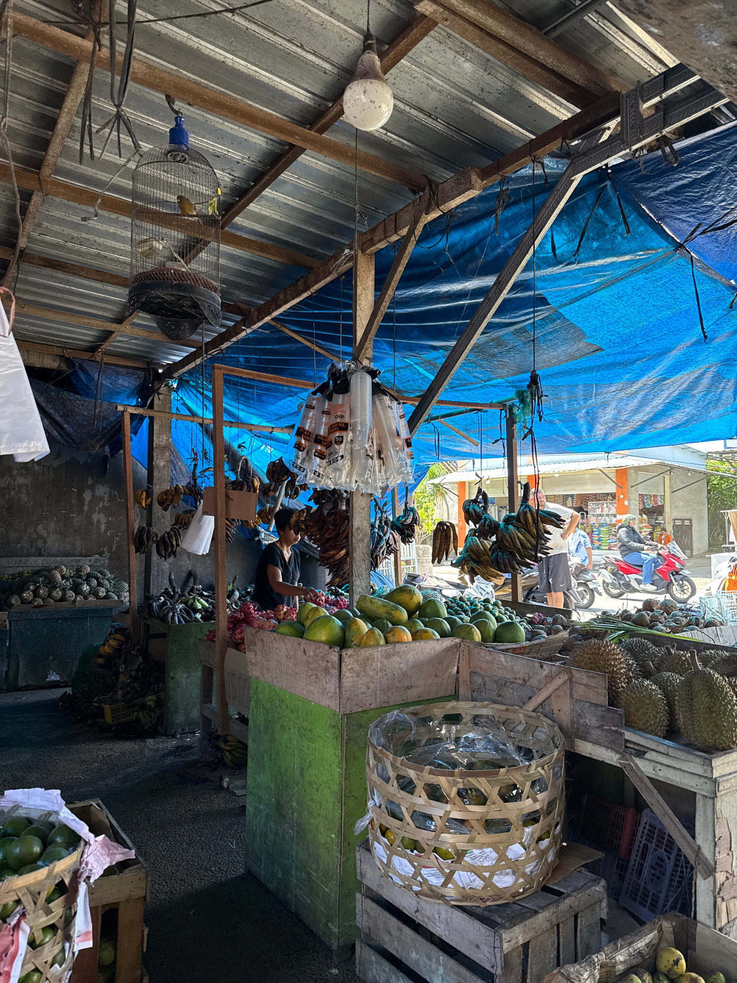 The image captures a market scene in Kutuh, Indonesia. The view is oriented down a covered alley. Fruits are stacked on the right. These include jackfruit, papayas, avocados, and dragon fruit. Several…read more