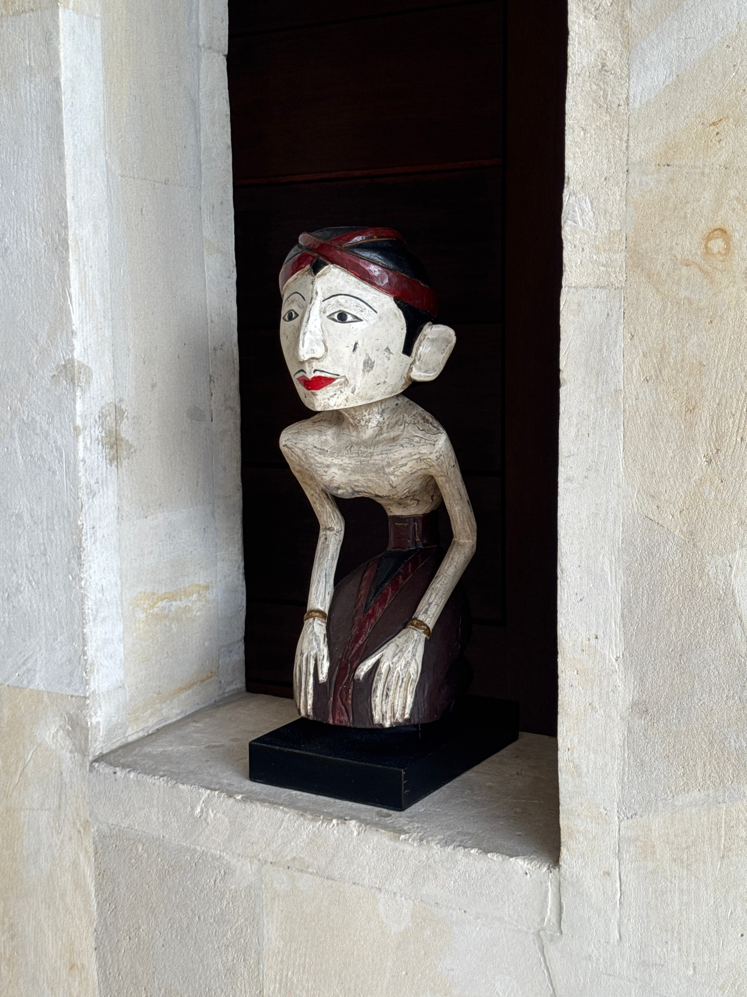 A wooden sculpture of a man, possibly a traditional Balinese figure, is situated in an opening within a light-colored, stuccoed or stone structure. The sculpture is painted with a white face, red lips…read more