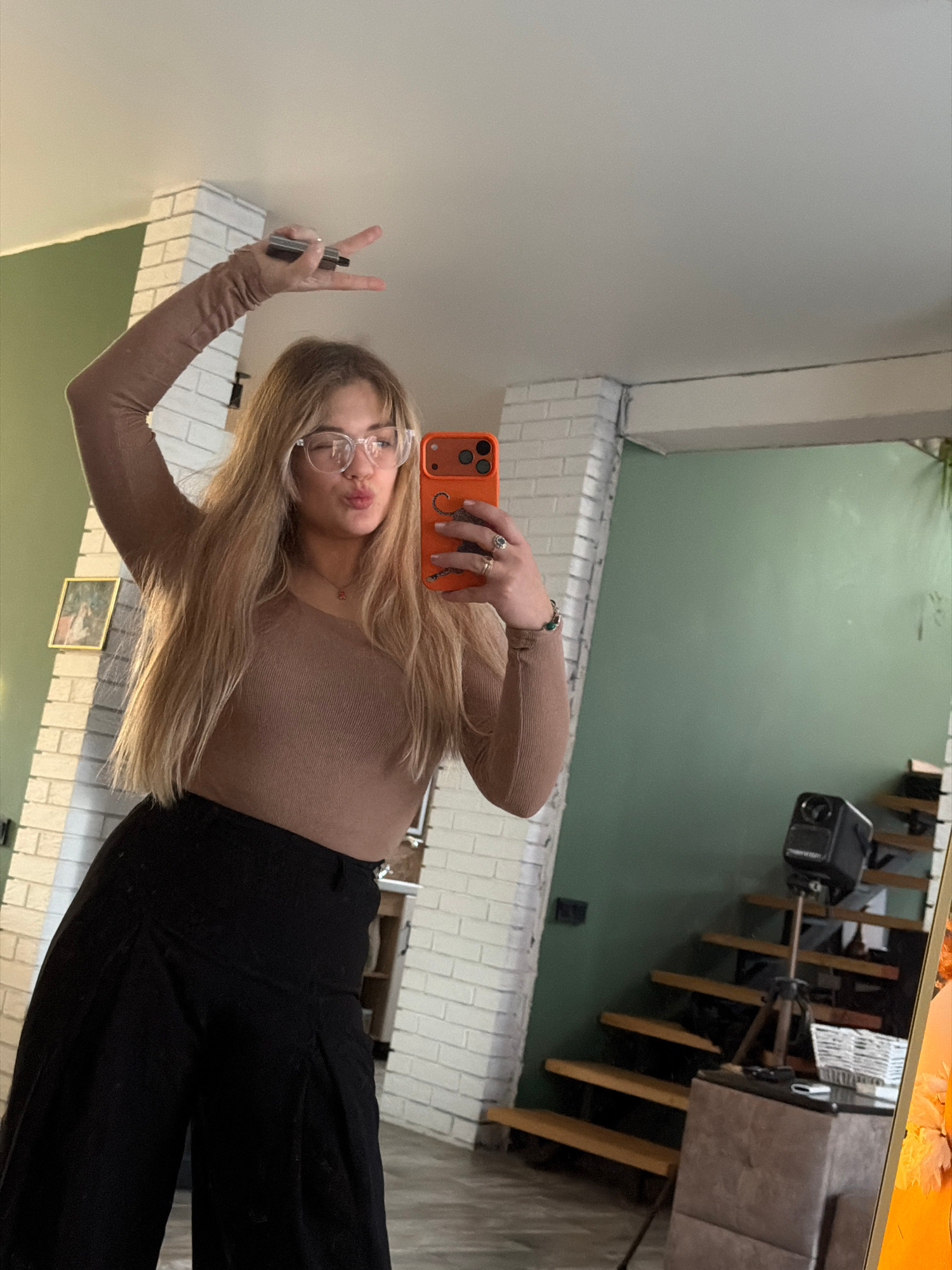A young woman with long, straight blonde hair and clear-rimmed glasses takes a mirror selfie in an indoor setting. She wears a light brown long-sleeved top and black pants. With her right hand, she ho…read more