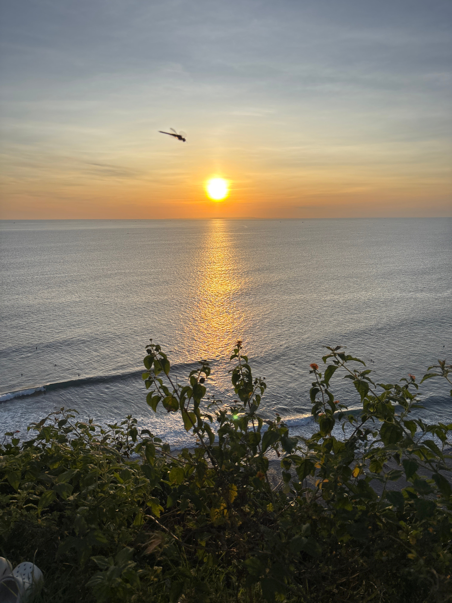 The image captures a sunset over the ocean in Kuta Selatan, Indonesia. The sun is positioned near the horizon, casting a golden reflection across the water's surface. A dragonfly is silhouetted agains…read more