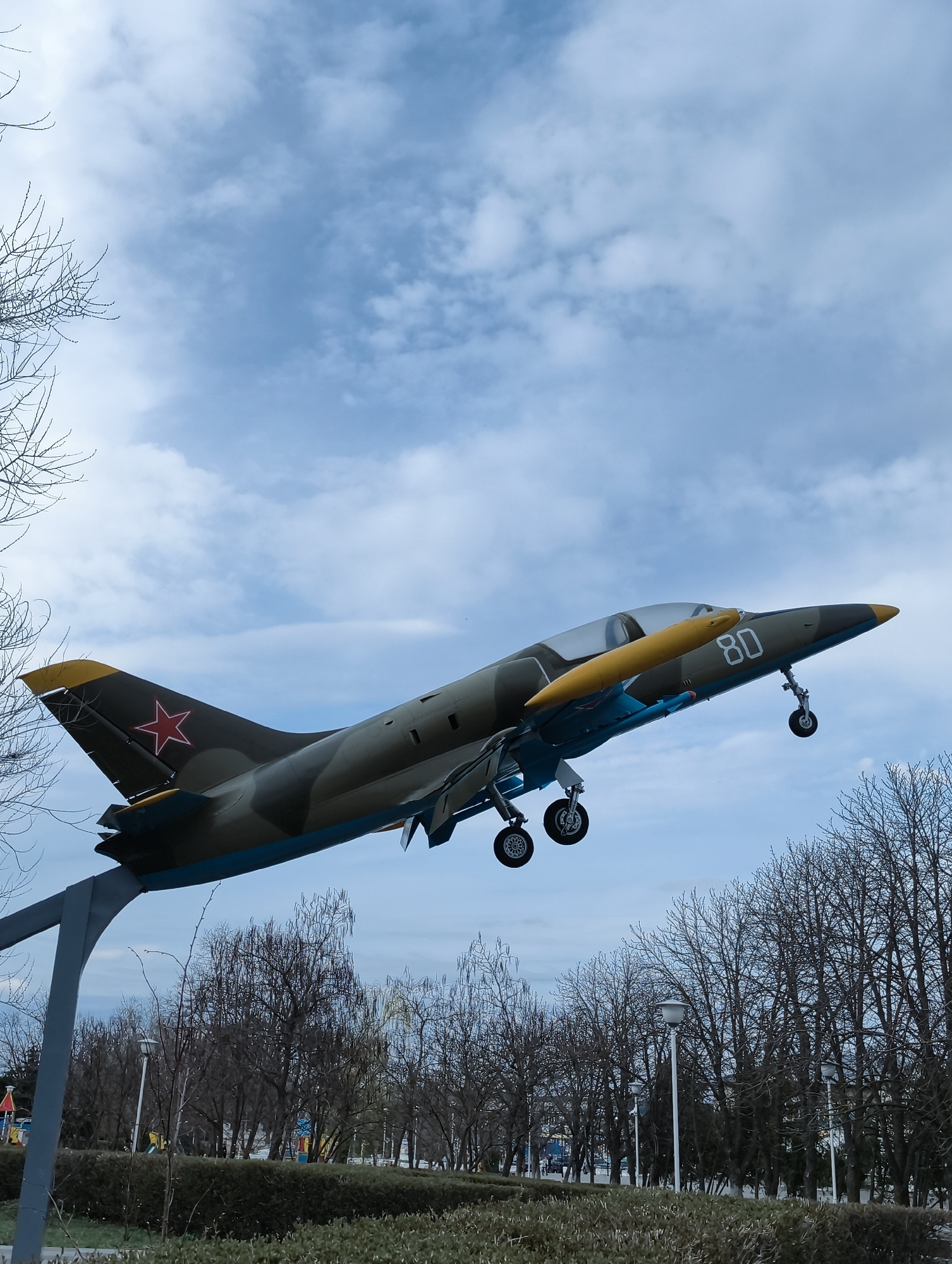 The image shows a military aircraft, specifically an L-39 Albatros trainer jet, mounted on a metal support stand as a monument in a park. The plane is painted in camouflage colors with a red star on t…read more