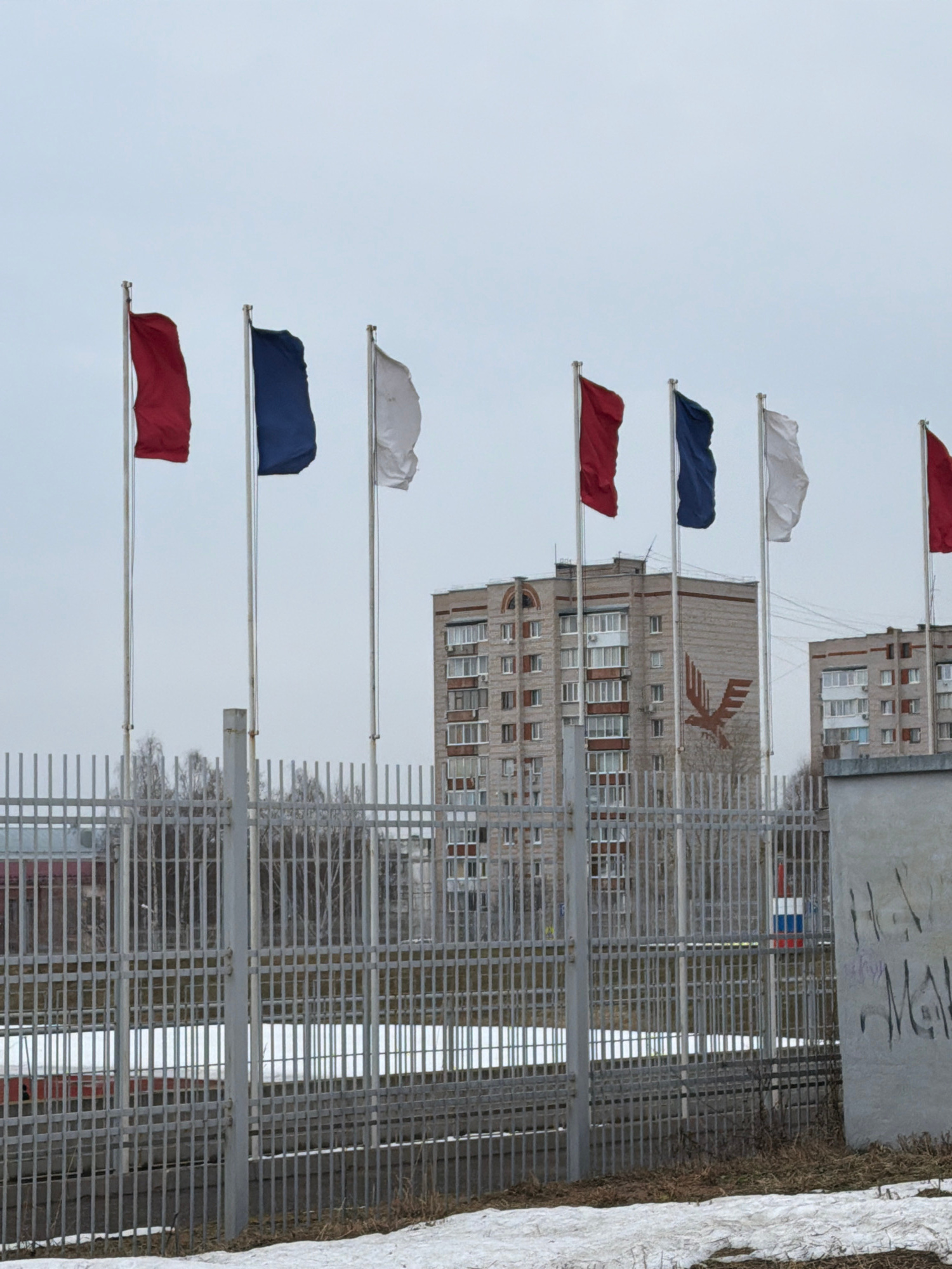 The image depicts the Monument "Anchor" in Votkinsk, Russia. Seven flags in the colors of the Russian flag (red, white, and blue) are visible on flagpoles in the foreground. In the background, a build…read more