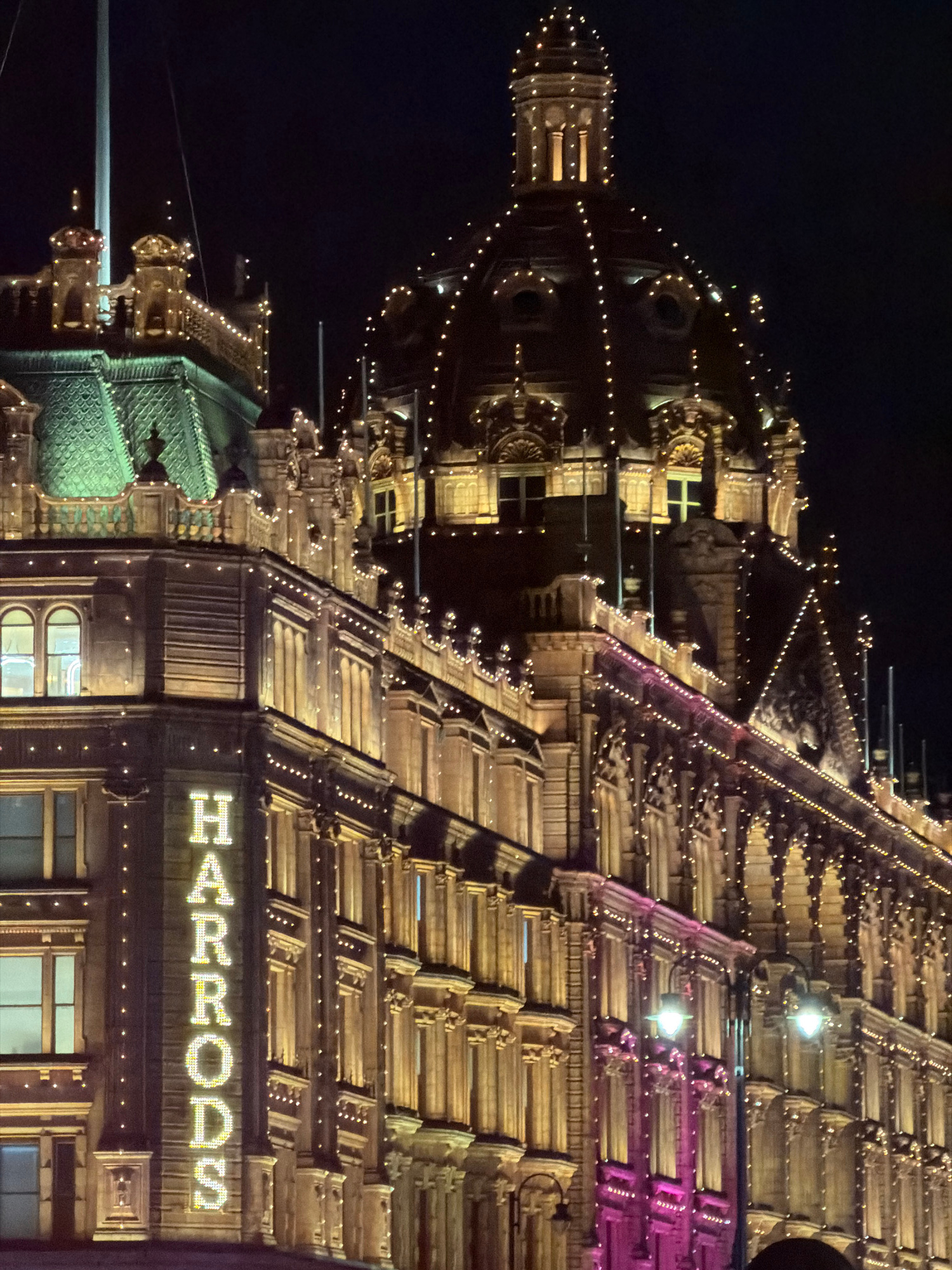 The image depicts Harrods department store in London at night. The building is elaborately decorated with lights, including strings of small lights outlining the architectural details and the store's…read more