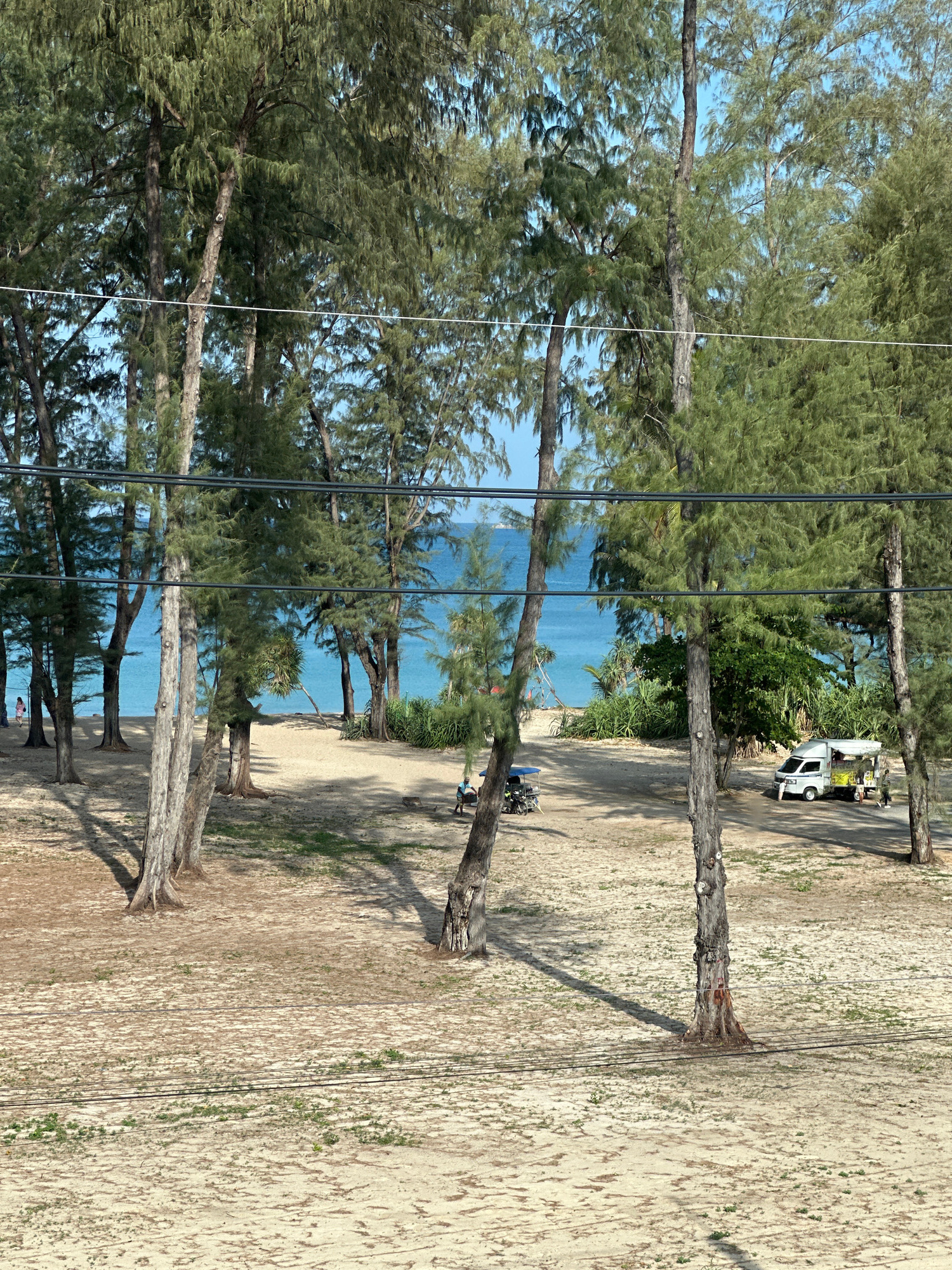 The scene is a beach in Choeng Thale, Thailand, viewed through pine trees. The sand is light in color. Utility lines run horizontally through the image. Distant turquoise water is visible between the…read more