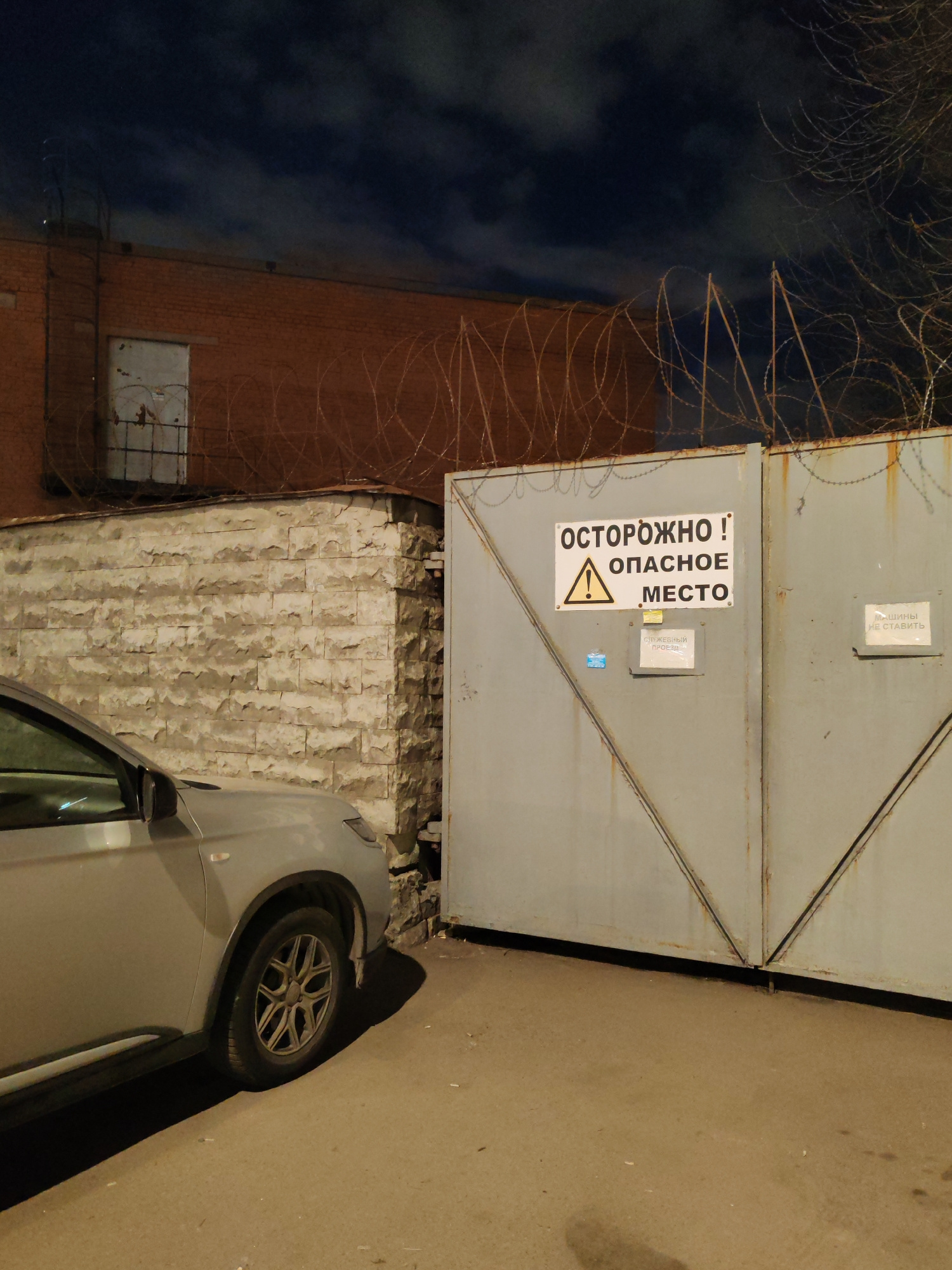The image captures a nighttime scene in what appears to be an industrial or restricted urban area in Saint Petersburg, Russia. The primary subjects are a light-colored car, a large metal gate, a stone wall, and a brick building, all under a dark, cloudy night sky. On the left, the front portion of a light grey car, possibly an SUV or crossover, is parked on a paved surface. Its front wheel and a significant part of its side are visible, illuminated by an unseen light source that casts long shadows to the right. To the right of the car is a textured stone wall, built from rough-hewn blocks, which forms a corner and extends towards the large gate. Behind this wall and above it, a red-brick building is visible, with a boarded-up or closed window on its side. Barbed wire is extensively strung along the top of the brick building and across the top of the metal gate, suggesting a secure or high-security area. The prominent feature is a large, grey, double-leaf metal gate with diagonal bracing. Several signs are affixed to it. A large warning sign in the center reads "ОСТОРОЖНО! ОПАСНОЕ МЕСТО" (CAUTION! DANGEROUS PLACE) with a yellow warning triangle icon. Below it, a smaller sign indicates "СЛУЖЕБНЫЙ ПРОЕЗД" (SERVICE DRIVEWAY or STAFF ACCESS). On the right panel of the gate, another sign states "МАШИНЫ НЕ СТАВИТЬ" (DO NOT PARK CARS or NO PARKING). The presence of these signs, coupled with the barbed wire, strongly indicates a restricted access zone. The sky is dark with visible clouds, and the scene is lit by artificial lights, creating strong contrasts and shadows. No human activity is depicted. | Open Wire